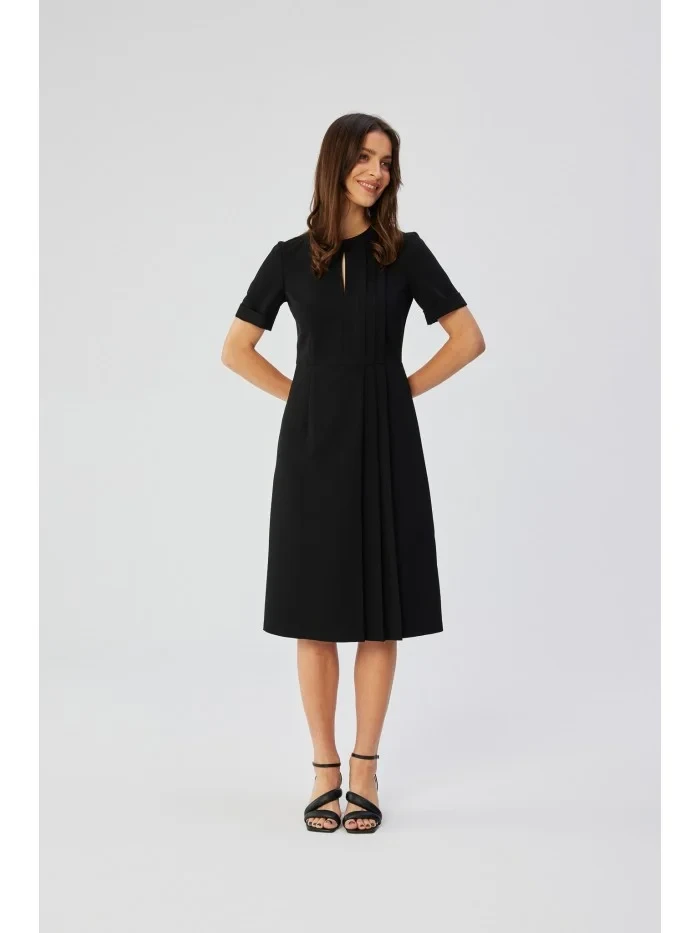 65% polyester 30% wiskoza 5% elastan PODROBNOSTI O PRODUKTU: tkané šaty s ozdobnými záhyby na bocích výstřih s klíčovou dírkou krátké rukávy s ohrnutím pod kolena skrytý zip na zádech bez podšívky naše modelka je 176 cm vysoká a nosí velikost S navrženo a vyrobeno v Polsku