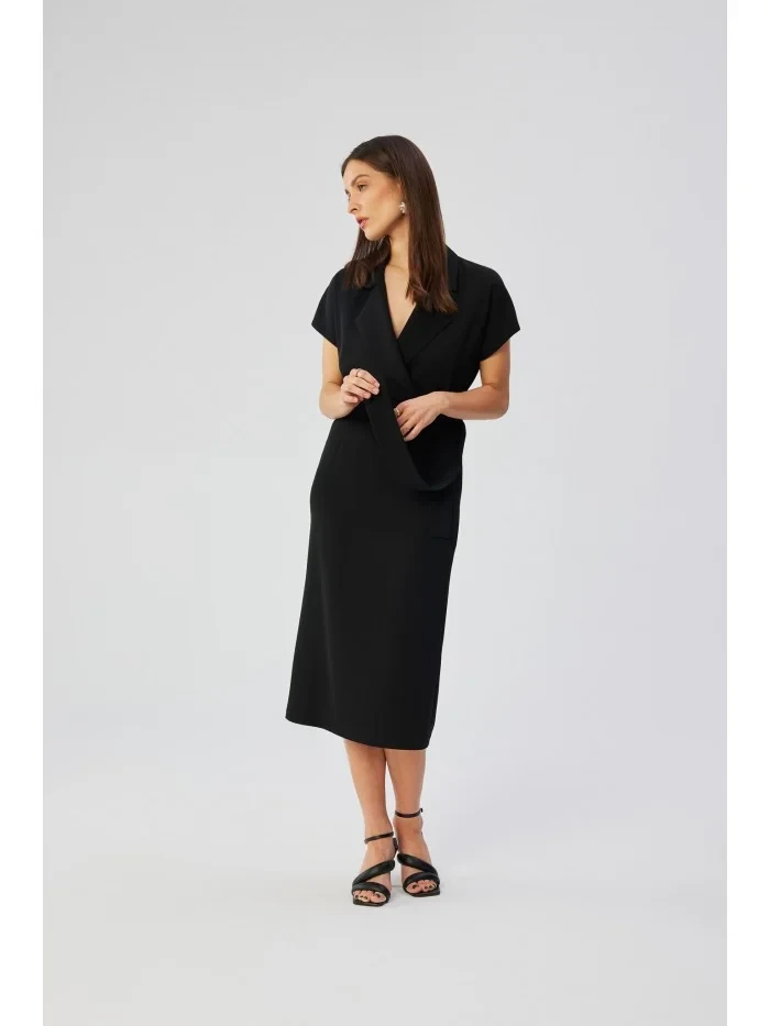 95% polyester 5% elastan PODROBNOSTI O PRODUKTU: košilové šaty z tkané látky s límečkem zavinovací vršek s krátkými netopýřími rukávy tužková sukně střední délky částečně elastický pas délka pod kolena rozparky na zádech nepodšitý pásek na zavázání naše modelka je 176 cm vysoká a nosí velikost S navrženo a vyrobeno v Polsku