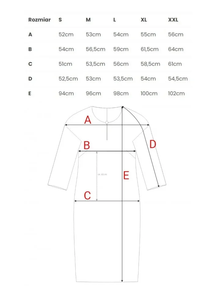 65% polyester 30% wiskoza 5% elastan DETAILY PRODUKTU: tkaný materiál uvolněný střih šaty s délkou nad kolena tříčtvrteční rukávy dělený výstřih s ozdobným knoflíkem skrytý zip vzadu nařasení vzadu bez podšívky naše modelka je vysoká 175 cm a nosí velikost S navrženo a vyrobeno v Polsku