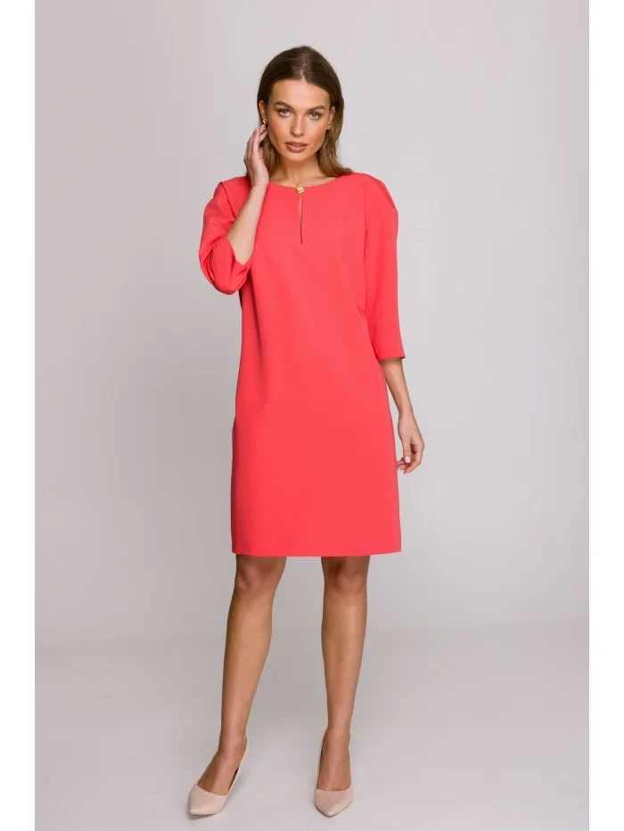 S394 Šaty uvolněného střihu s výstřihem s klíčovou dírkou - korálová barva