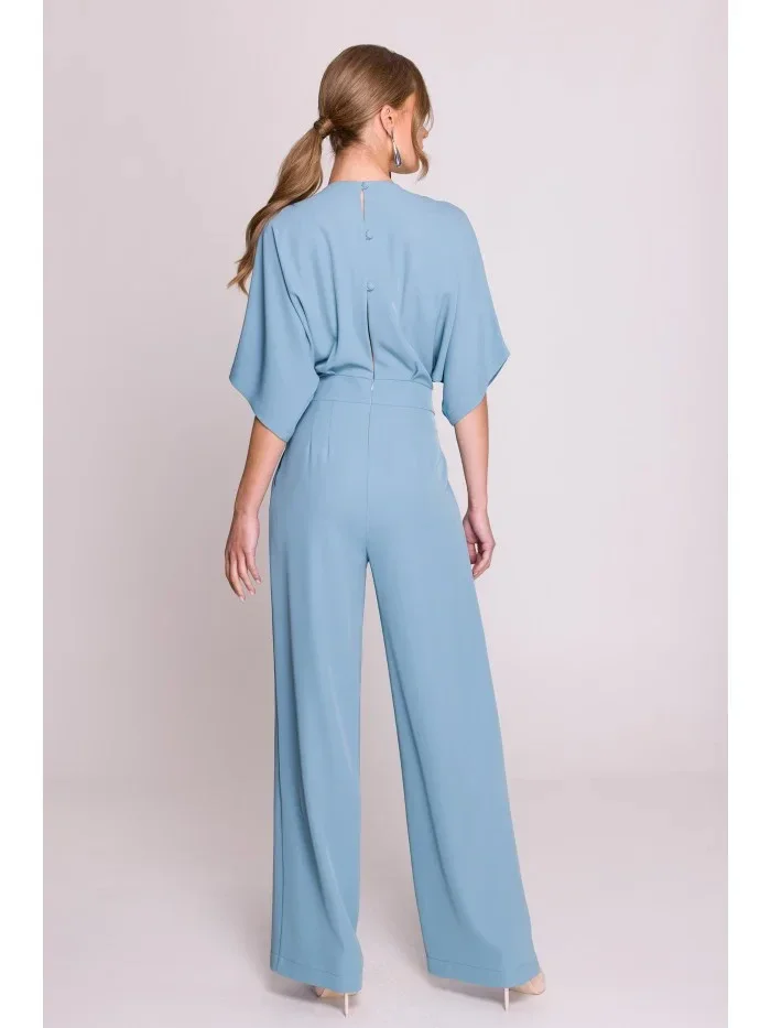 S395 Kombinéza s širokými nohavicemi a zavinovacím výstřihem - nebesky modrá