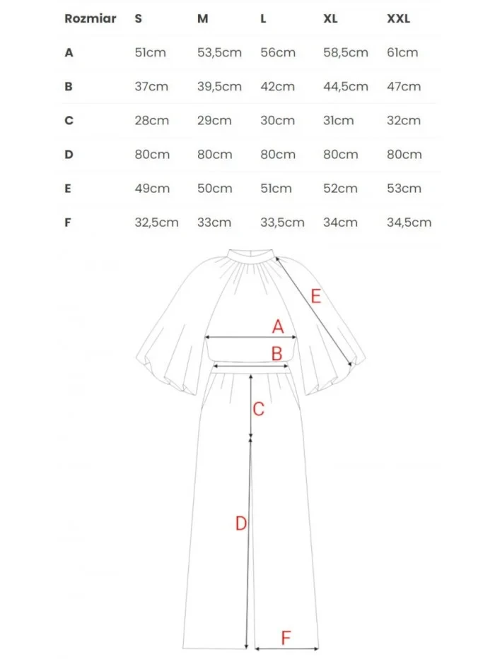 95% polyester 5% elastan DETAILY PRODUKTU: tkaná látka jednodílný overal široké kimonové rukávy nabírané vpředu se stojáčkem u krku dělená záda se zavazováním široká nohavice boční kapsy skrytý zip na zádech naše modelka je vysoká 175 cm a nosí velikost S navrženo a vyrobeno v Polsku