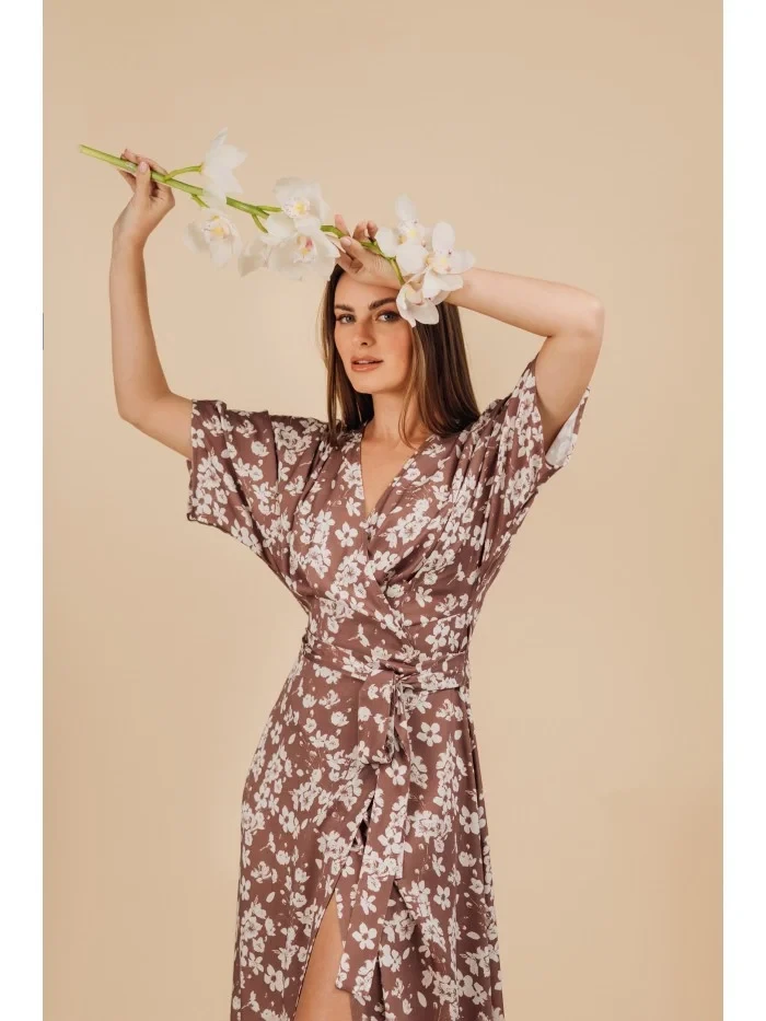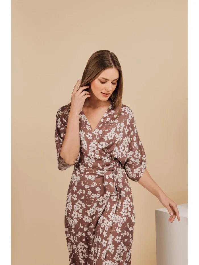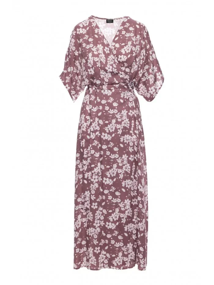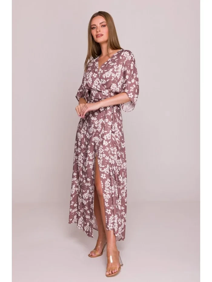 materiál: lehká, vzdušná viskózová tkanina s tištěným vzorem PODROBNOSTI O PRODUKTU Výstřih: výstřih do V Rukávy: volné, délka k loktům Zapínání: zavazování v pase Kapsy: žádné Podšívka: žádná Vzor: květinový Model: S405 Navrženo a vyrobeno v Polsku Modelka měří 170 cm a má na sobě velikost S STYL A STŘIH Střih: volný Tvar: v pase stažený, směrem k lemu rozšířený Délka: maxi / dlouhé Rozparky: rozparek vpředu