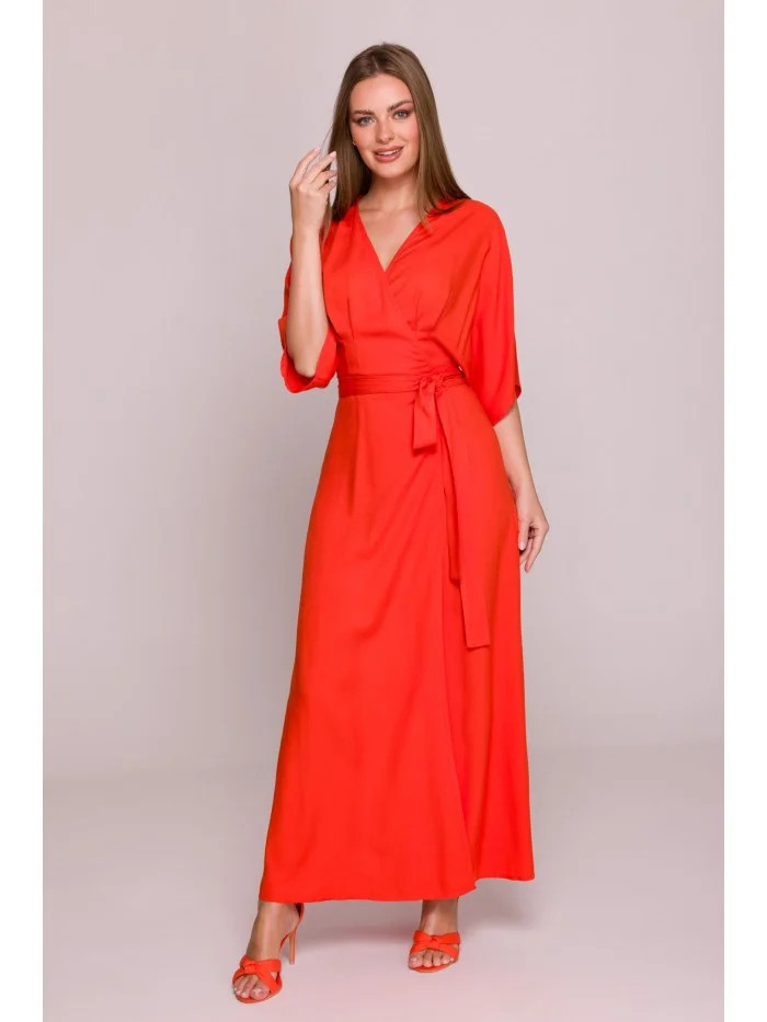 materiál: lehká viskóza Povrchová úprava: hladká, saténová PODROBNOSTI O PRODUKTU Pas: klasický střih s páskem na zavázání, který zvýrazňuje pas Zapínání: zavazování v pase, zavinovací střih Rukávy: volné, délka po lokty Kapsy: žádné Model: S406 Navrženo a vyrobeno v Polsku Modelka je vysoká 170 cm a má na sobě velikost S STYL A STŘIH Střih: zavinovací střih Tvar: vypasovaný v pase, splývavý podél těla Délka: maxi délka