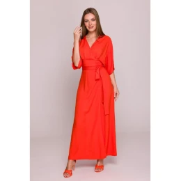 S406 Viskózové maxi šaty se zavinovacím vzorem - korálová barva