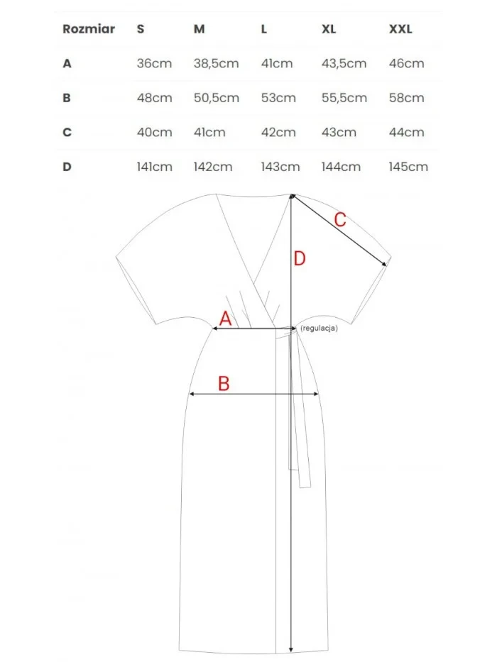 materiál: lehká viskóza Povrchová úprava: hladká, saténová PODROBNOSTI O PRODUKTU Pas: klasický střih s páskem na zavázání, který zvýrazňuje pas Zapínání: zavazování v pase, zavinovací střih Rukávy: volné, délka po lokty Kapsy: žádné Model: S406 Navrženo a vyrobeno v Polsku Modelka je vysoká 170 cm a má na sobě velikost S STYL A STŘIH Střih: zavinovací střih Tvar: vypasovaný v pase, splývavý podél těla Délka: maxi délka