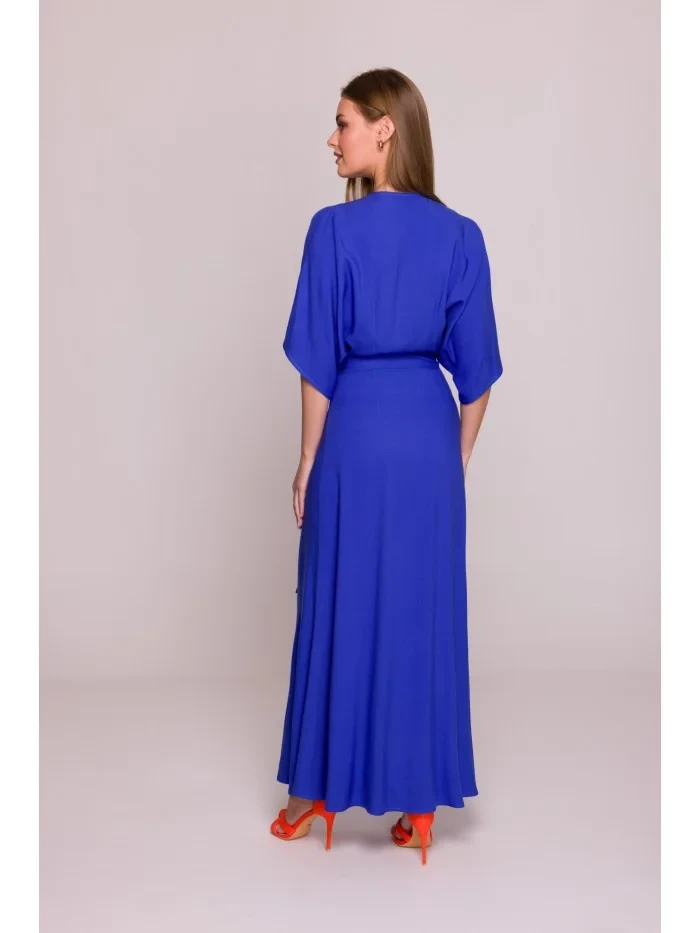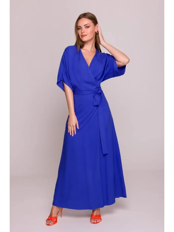 materiál: lehká viskóza Povrchová úprava: hladká, saténová PODROBNOSTI O PRODUKTU Pas: klasický střih s páskem na zavázání, který zvýrazňuje pas Zapínání: zavazování v pase, zavinovací střih Rukávy: volné, délka po lokty Kapsy: žádné Model: S406 Navrženo a vyrobeno v Polsku Modelka je vysoká 170 cm a má na sobě velikost S STYL A STŘIH Střih: zavinovací střih Tvar: vypasovaný v pase, splývavý podél těla Délka: maxi délka