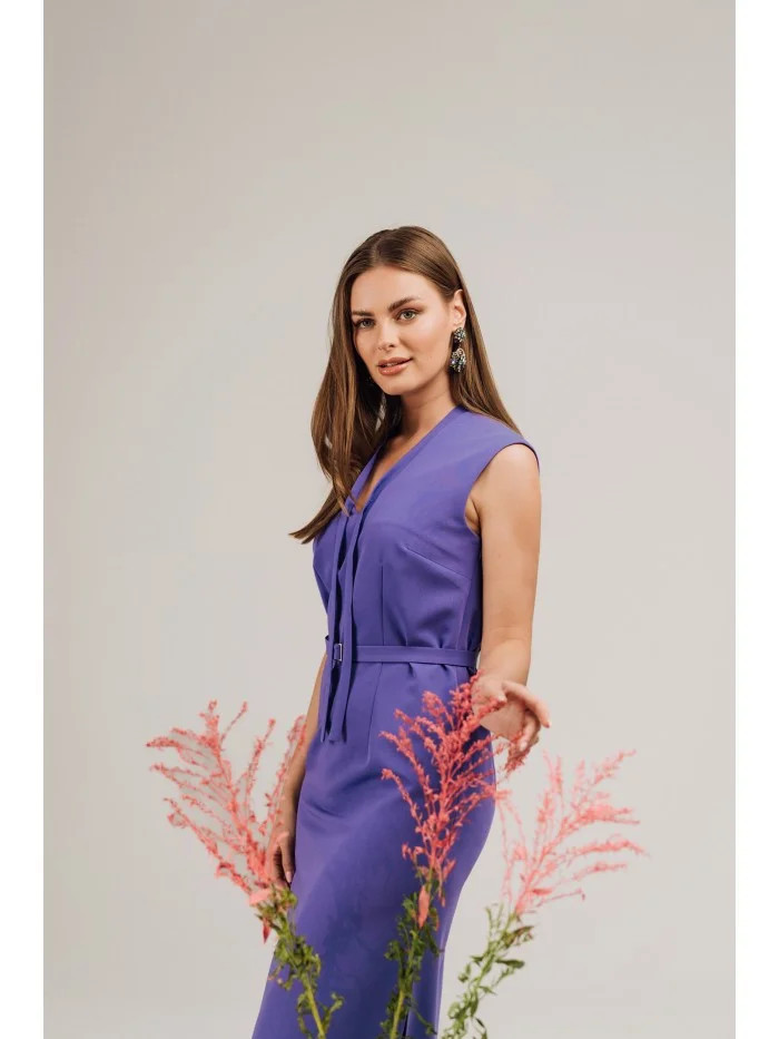 S410 Šaty áčkového střihu s vázáním a výstřihem do V - fialové