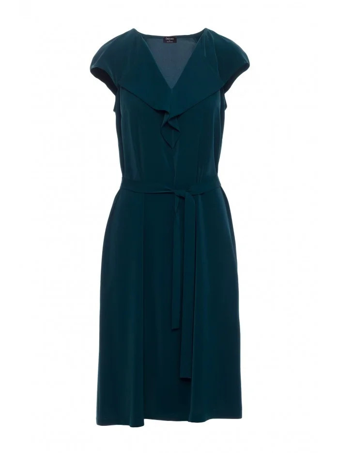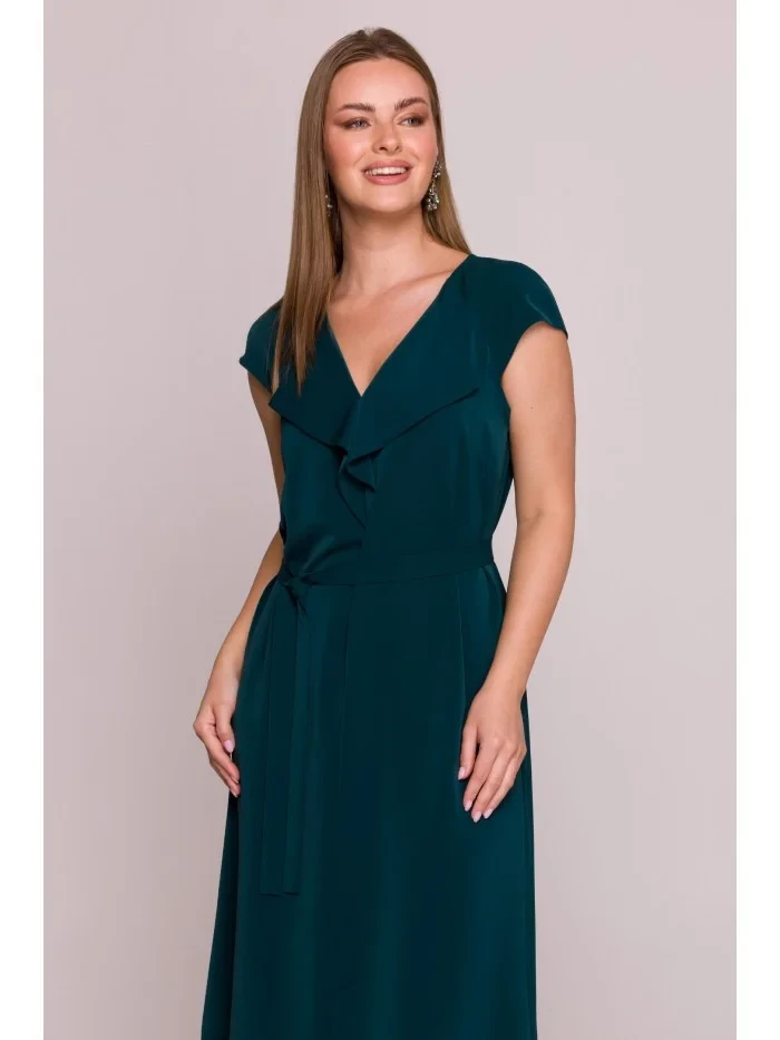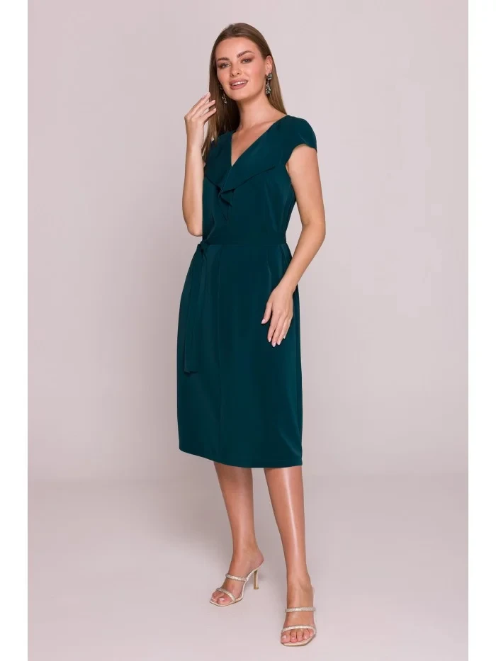 materiál: 95% polyester 5% elastan Materiál: hladká tkanina s jemným leskem PODROBNOSTI O PRODUKTU Výstřih: výstřih do V s ozdobným volánkem Rukávy: krátké, mírně spadlé Zapínání: skrytý boční zip Kapsy: žádné Podšívka: žádná Doplňky: látkový pásek na zavázání v pase Model: S411 Navrženo a vyrobeno v Polsku Modelka je vysoká 170 cm a má na sobě velikost S STYL A STŘIH Střih: mírně rozšířený směrem dolů Tvar: áčkový Délka: midi, pod kolena