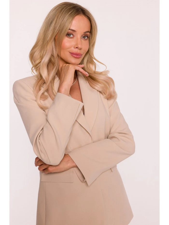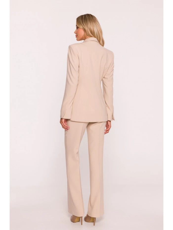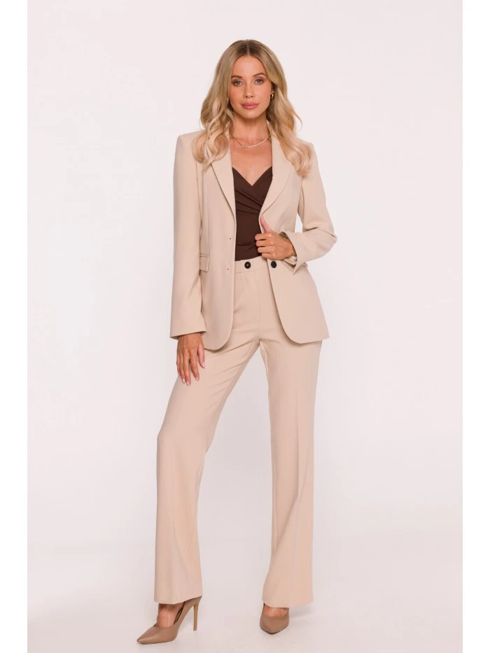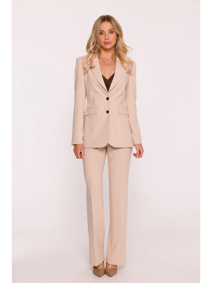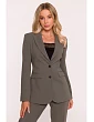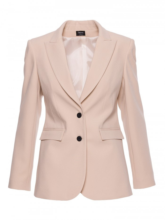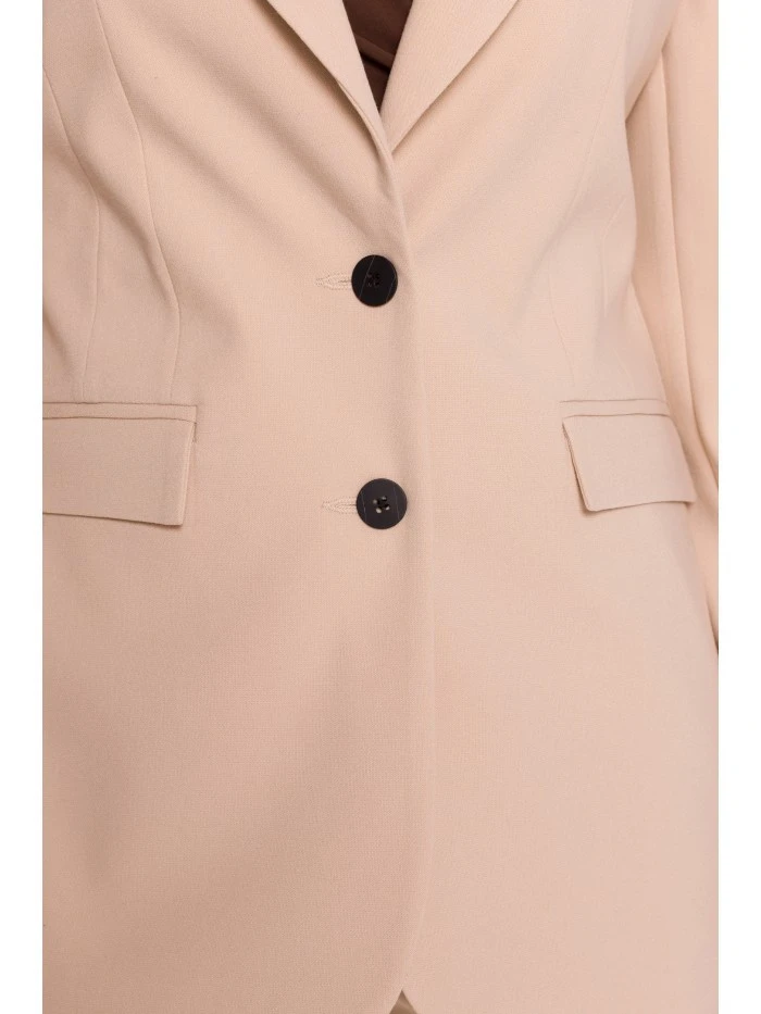 HLAVNÍ LÁTKA 63% polyester 33% wiskoza 4% elastan PODŠÍVKA 100% polyester LÁTKA: hladká tkaná látka s měkkým povrchem PODROBNOSTI O PRODUKTU Límec: klasický s ručně zakončenými klopami Zapínání: jednořadové, na knoflíky Pas: výrazně vypasovaný se záševky vpředu i vzadu Rukávy: dlouhé, úzké Podšívka: plně podšitá Model: S417 Navrženo a vyrobeno v Polsku Modelka měří 174 cm a nosí velikost S STYL A STŘIH Styl: jednořadové sako, výrazně vypasované v pase Tvar: rovný s jasně ohraničenou linií pasu Délka: pod linii boků