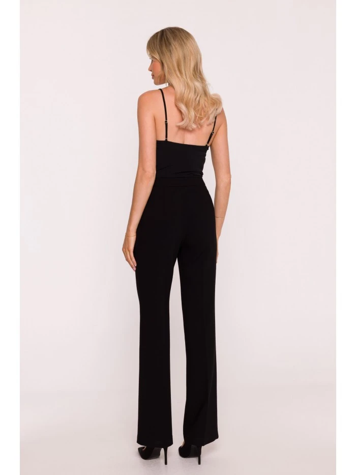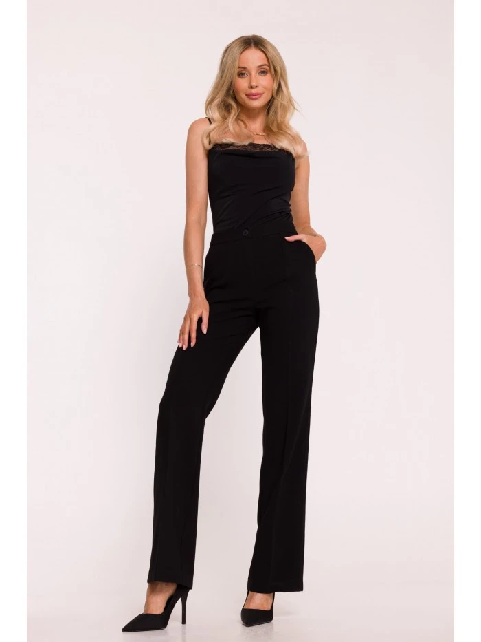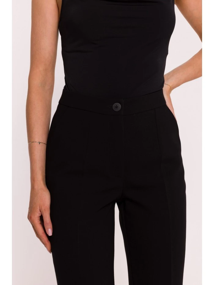 63% polyester 33% viskóza 4% elastan LÁTKA Tkanina: hladká tkanina s jemným povrchem PODROBNOSTI O VÝROBKU Pas: střední výška Zapínání: knoflík vpředu a skrytý zip Kapsy: boční kapsy Nohavice: dlouhé, rovné, s řasením Podšívka: žádná Model: S418 Navrženo a vyrobeno v Polsku Modelka je vysoká 174 cm a nosí velikost S STYL A STŘIH Styl: klasické kalhoty na míru Tvar: vypasované v pase a na bocích, rovné nohavice Délka: po celé délce, až na zem