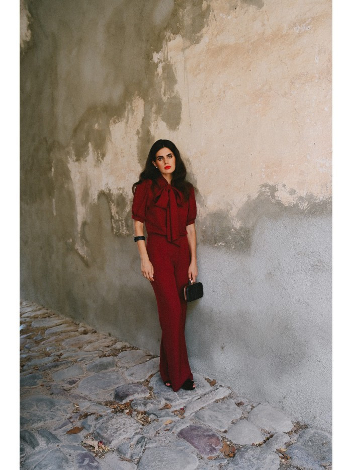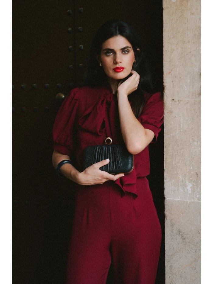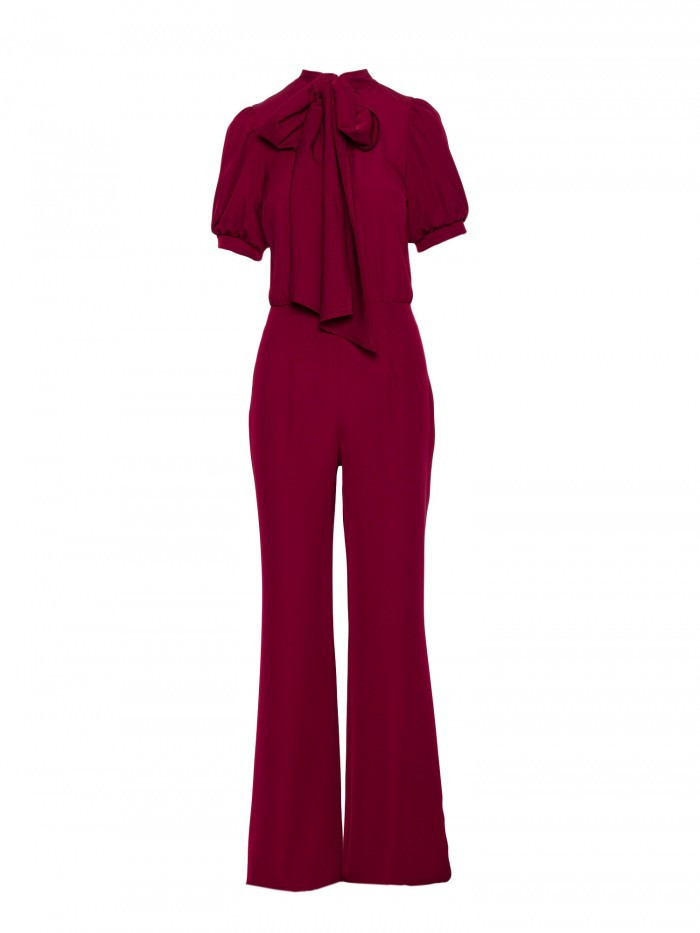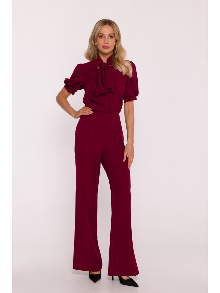 materiál: 95% polyester 5% elastan LÁTKA: hladká tkanina s jemným leskem PODROBNOSTI O PRODUKTU Výstřih: výstřih do V se stojáčkem přecházejícím v zavazování Rukávy: krátké, nadýchané, zakončené manžetami a jemným nabíráním Nohy: dlouhé, široké, směrem dolů mírně rozšířené Pas: zvýrazněný vysokým nártem Zapínání: skrytý zip na zádech Model: S421 Navrženo a vyrobeno v Polsku Modelka je vysoká 174 cm a nosí velikost S STYL A STŘIH Styl: elegantní jednodílný overal Tvar: vypasovaný v pase, mírně nařasený vršek s ozdobným zavazováním, volnější nohavice Délka: po zem
