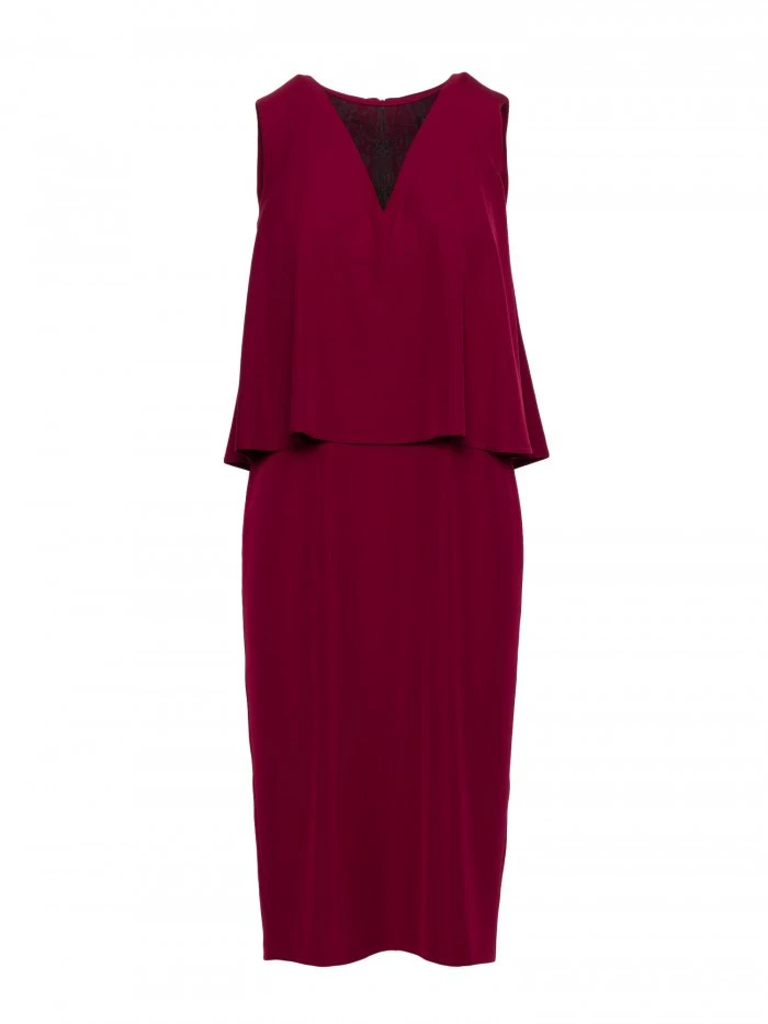 materiál: 95% polyester 5% elastan LÁTKA: hladká tkanina s jemným leskem PODROBNOSTI O PRODUKTU Výstřih: ve tvaru V s jemnou krajkovou vsadkou Rukávy: bez rukávů Sukně: vypasovaný tužkový střih s rozparkem na zádech Horní díl: dvouvrstvý - volnější horní vrstva decentně zakrývá pas a boky Zapínání: dva skryté zipy na zádech Model: S422 Navrženo a vyrobeno v Polsku Modelka je vysoká 174 cm a nosí velikost S STYL A STŘIH Styl: elegantní tužkové šaty s dvouvrstvým horním dílem Tvar: vypasovaná sukně, volnější horní díl s krajkovým detailem Délka: pod kolena