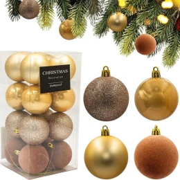 SADA 16 BOMBÍ 4 FACES GOLD je hotové řešení, které vám umožní vytvořit elegantní a ucelenou dekoraci vánočního stromku během několika minut. Díky čtyřem různým povrchovým úpravám - matné, perleťové, třpytivé a sametové - získá stromek hloubku a jedinečný charakter jako v profesionálním interiéru.