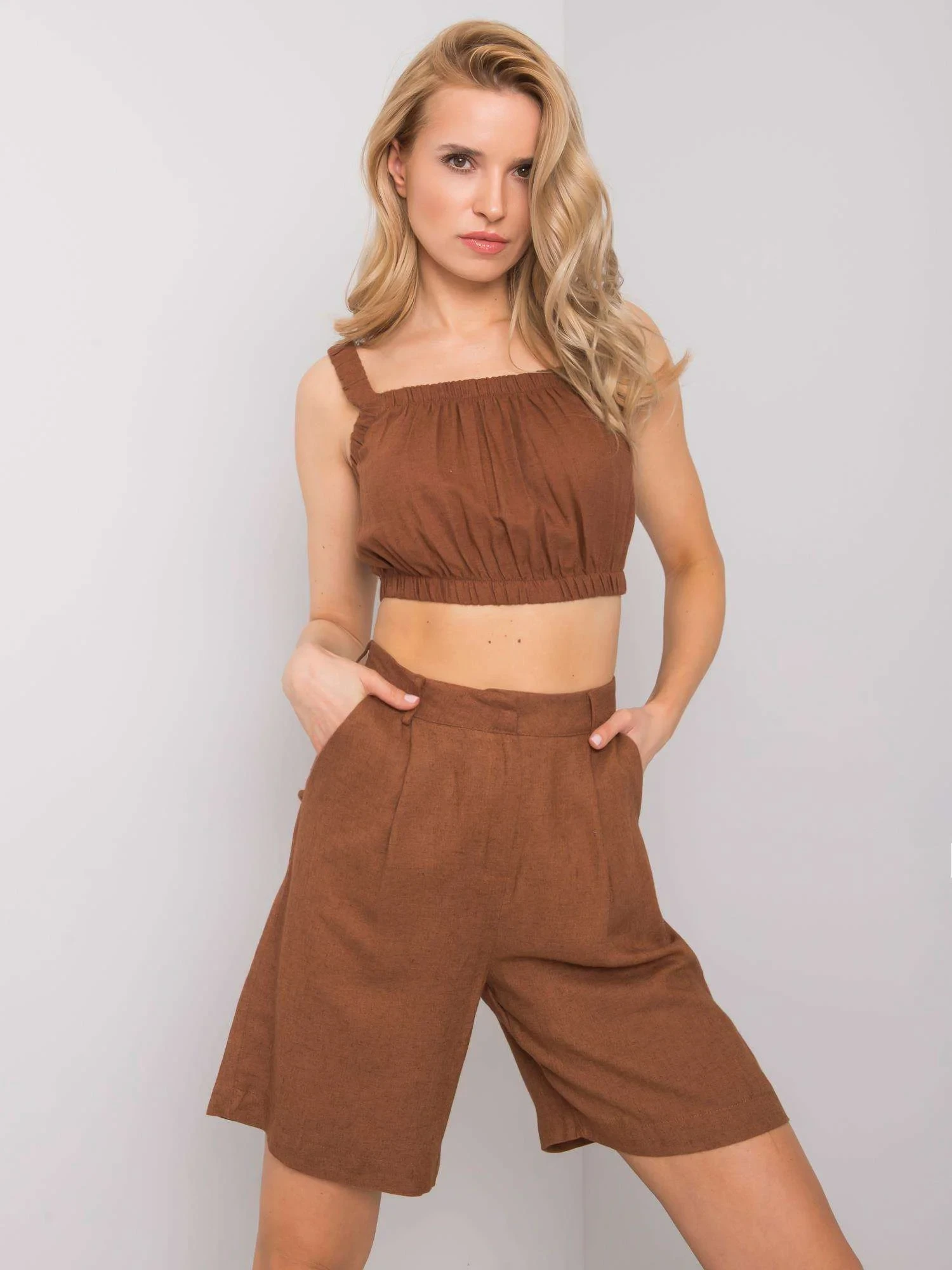 Rozměry soupravy ve velikosti S: top - šířka v podpaží: 34 cm (na plocho), šířka v podpaží: 59 cm (po natažení), celková délka: 37 cm, šortky - šířka v pase: 35 cm, výška v pase - 34 cm, šířka v bocích - 55 cm, celková délka: 54 cm
