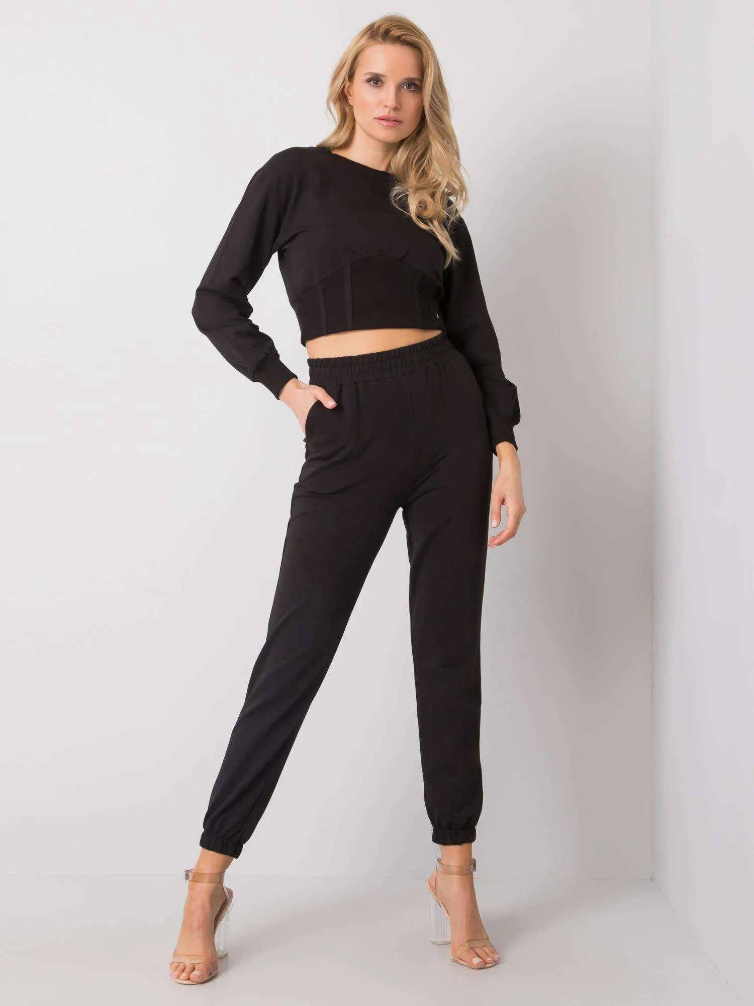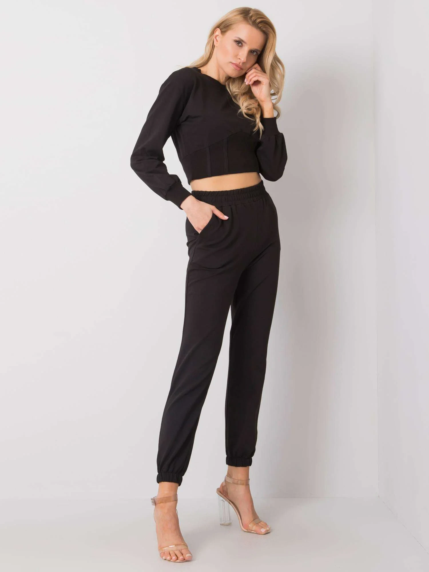 Rozměry soupravy ve velikosti S měřené na plocho: šířka v podpaží - 44 cm, délka halenky - 40 cm, rukávy - 53 cm, šířka dole - 34 cm, šířka kalhot v pase - 34 cm, šířka v bocích - 45 cm, délka kalhot - 96 cm