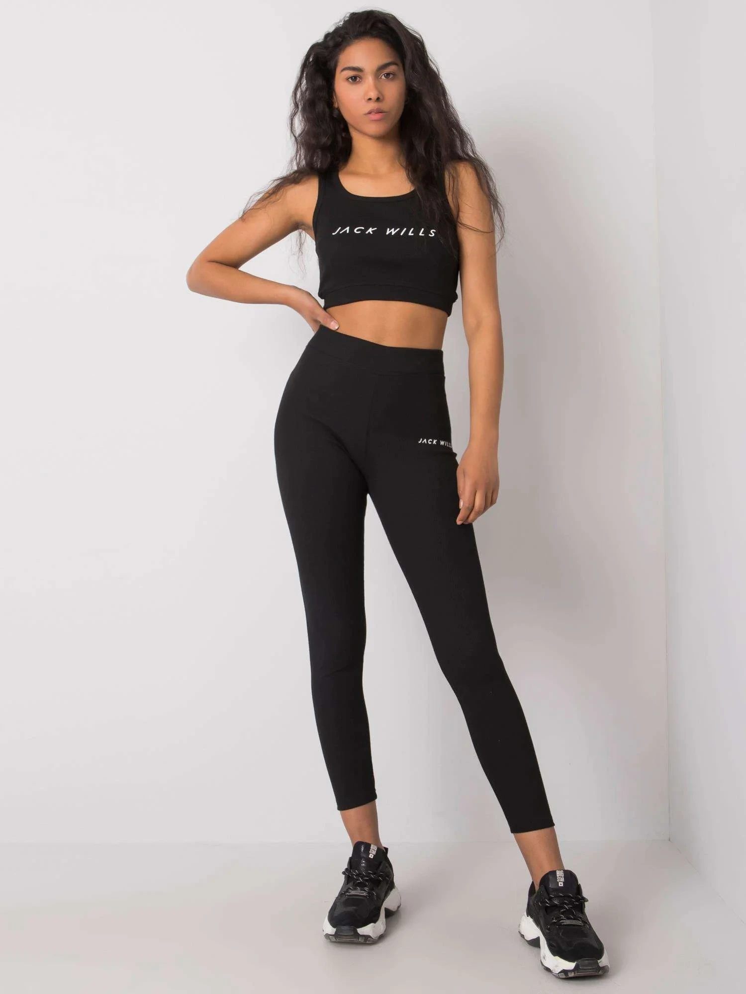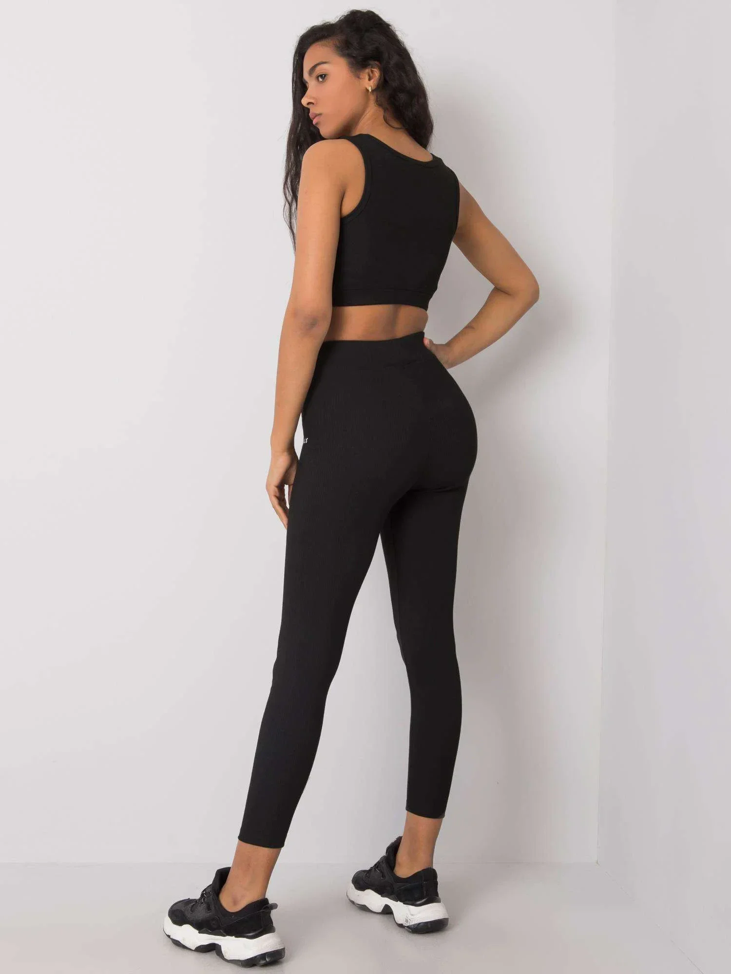 Rozměry soupravy ve velikosti S měřené na plocho: top: šířka v podpaží - 31 cm, šířka dole - 30 cm, celková délka - 34 cm, legíny: šířka v pase - 30 cm (na plocho), šířka v pase - 47 cm (po natažení), šedá v bocích - 34 cm, celková délka - 95 cm, výška v pase - 33 cm.