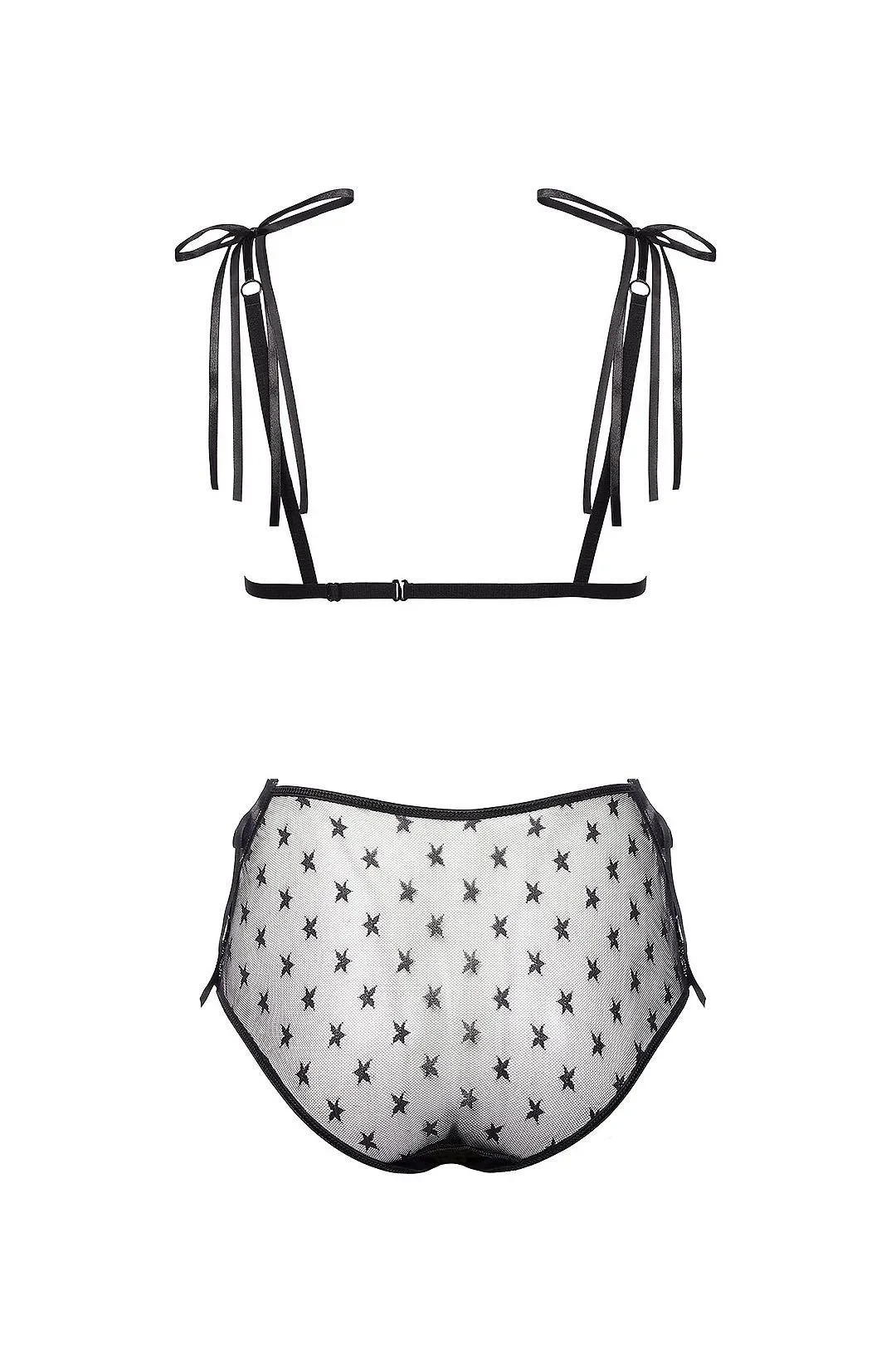 Průsvitný komplet sladce svázaný na bocích, vyrobený z jemného elastického tylu. Součástí je krásná podprsenka a kalhotky s vysokým pasem. Tkanina v roztomilých hvězdičkách - měkká, jako svůdný, smyslný voál... Ramínka sladce uvázaná na ramenou. Složení: 80 % polyamid, 20 % elastan.EAN čárové kódy zboží jsou: