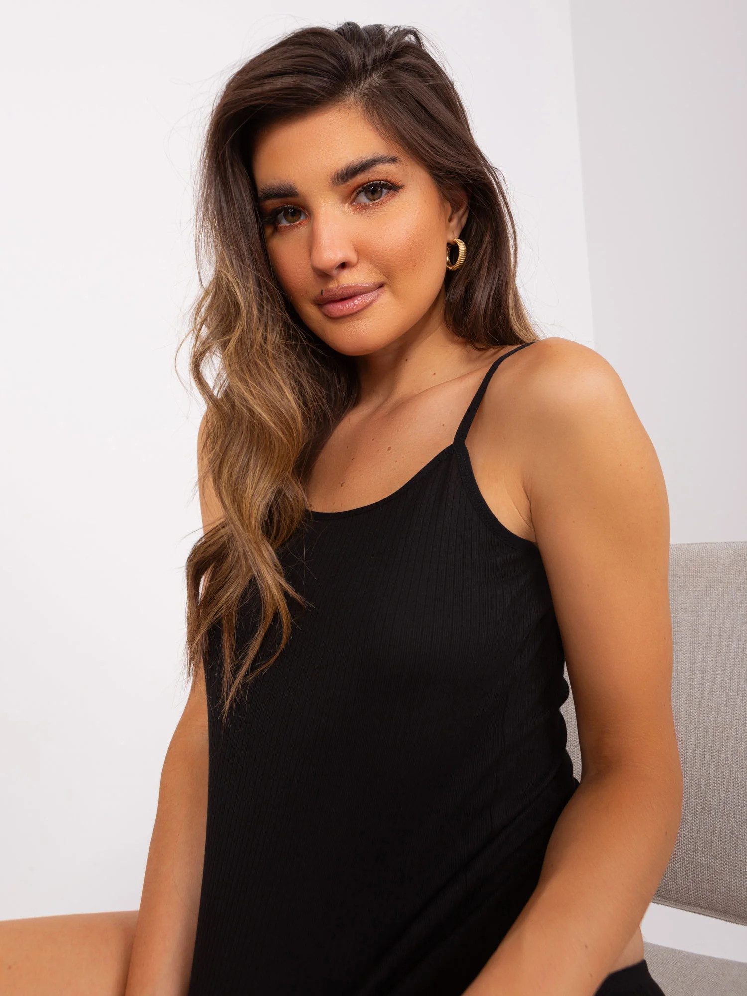 Černý žebrovaný noční komplet s horním dílem bez ramínek .