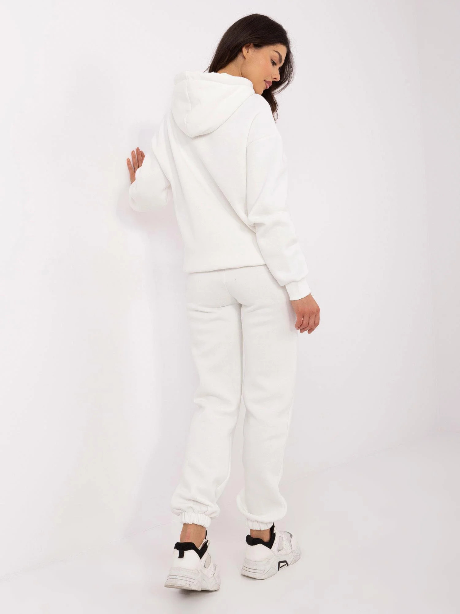Wymiary kompletu w rozmiarze S: szerokość bluzy pod pachami - 61 cm, długość rękawa - 56 cm (od szwu), długość całkowita - 68 cm, szerokość spodni w pasie - 32 cm, szerokość spodni w biodrach - 46 cm, długość spodni - 100 cm.