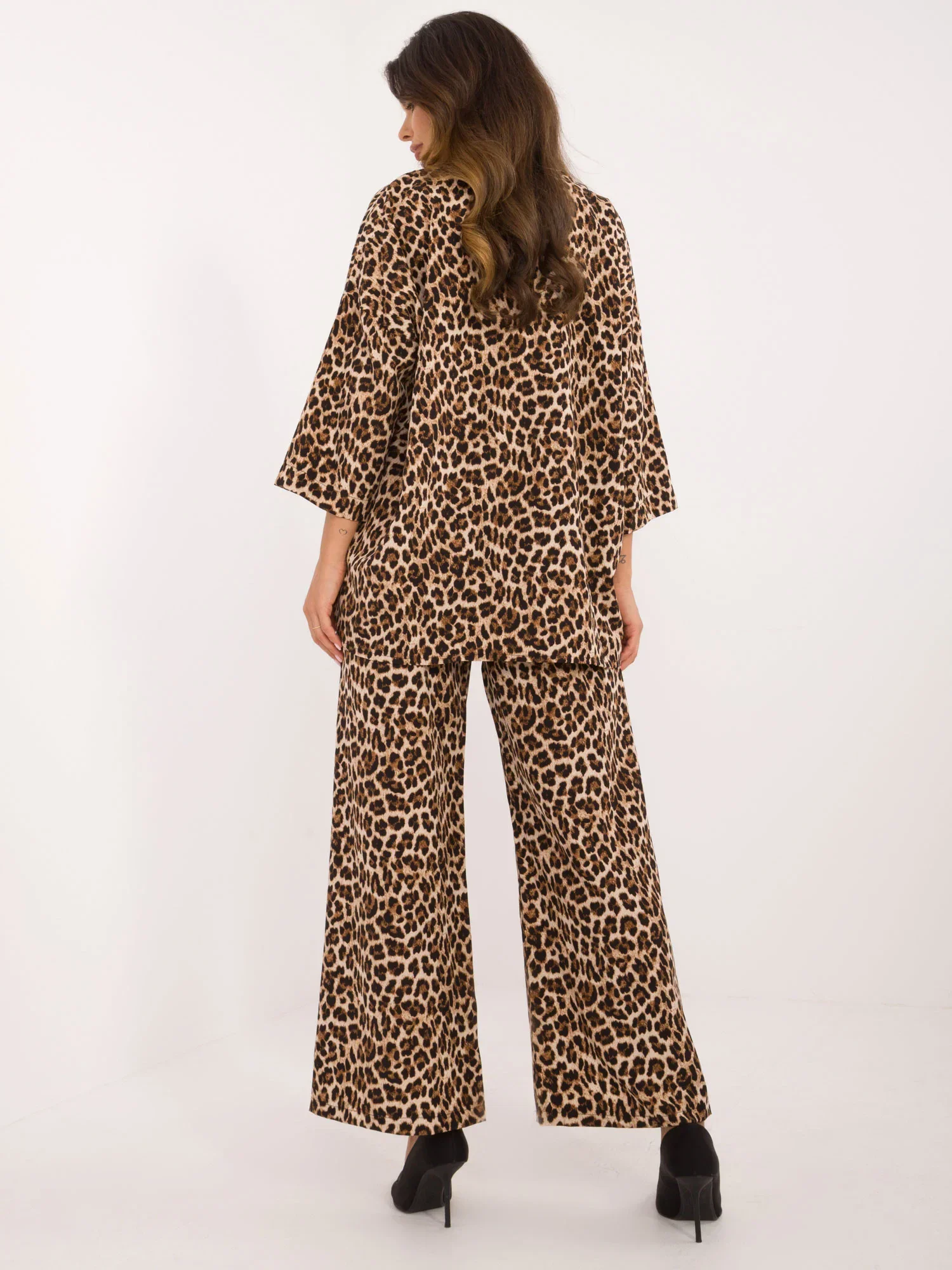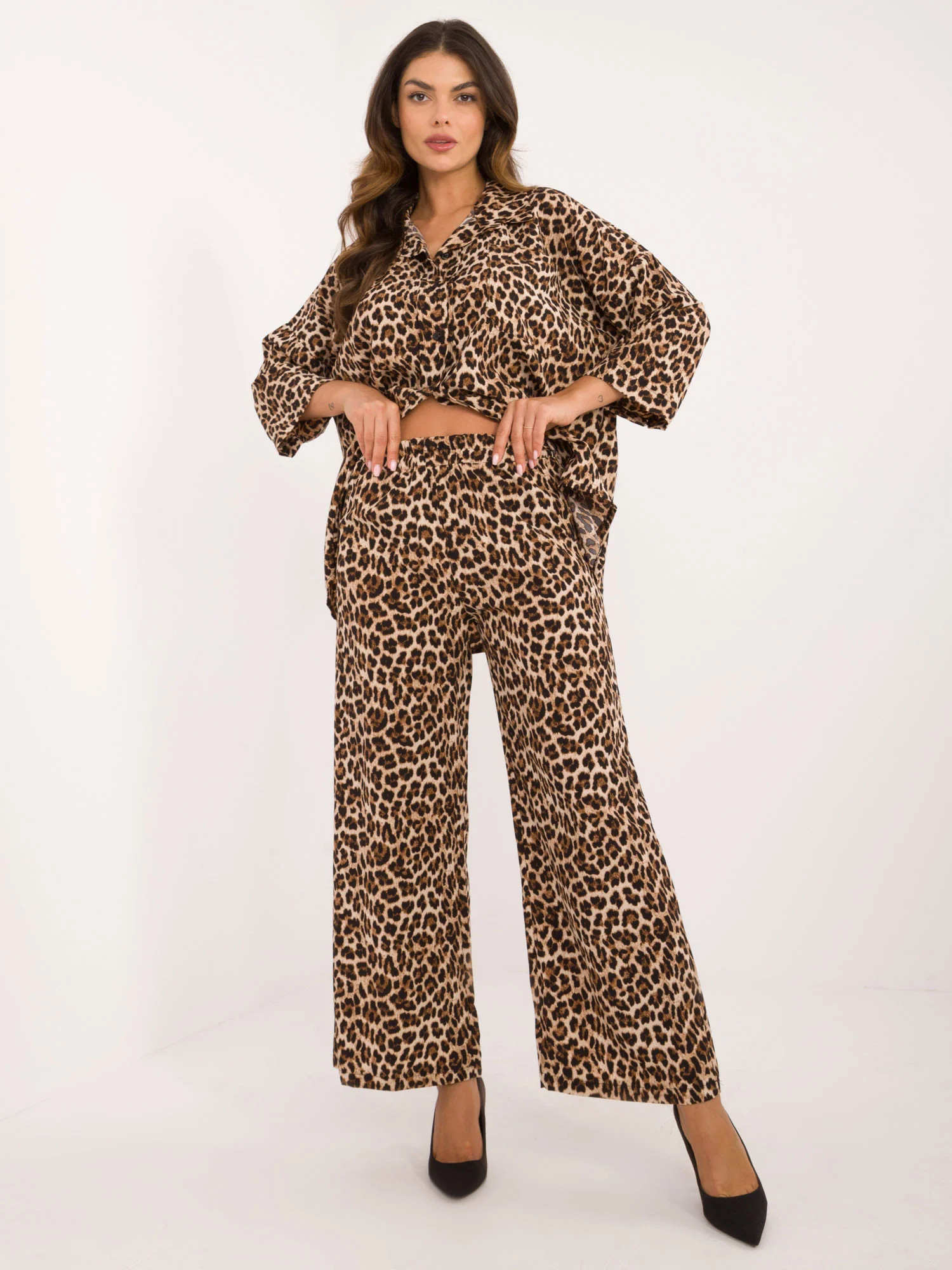 Rozměry soupravy ve velikosti S/M. měřeno na plocho: šířka košile v podpaží - 70 cm, délka rukávů - 47 cm, délka košile - 75 cm, šířka kalhot v pase - 34 cm, délka kalhot - 100 cm.