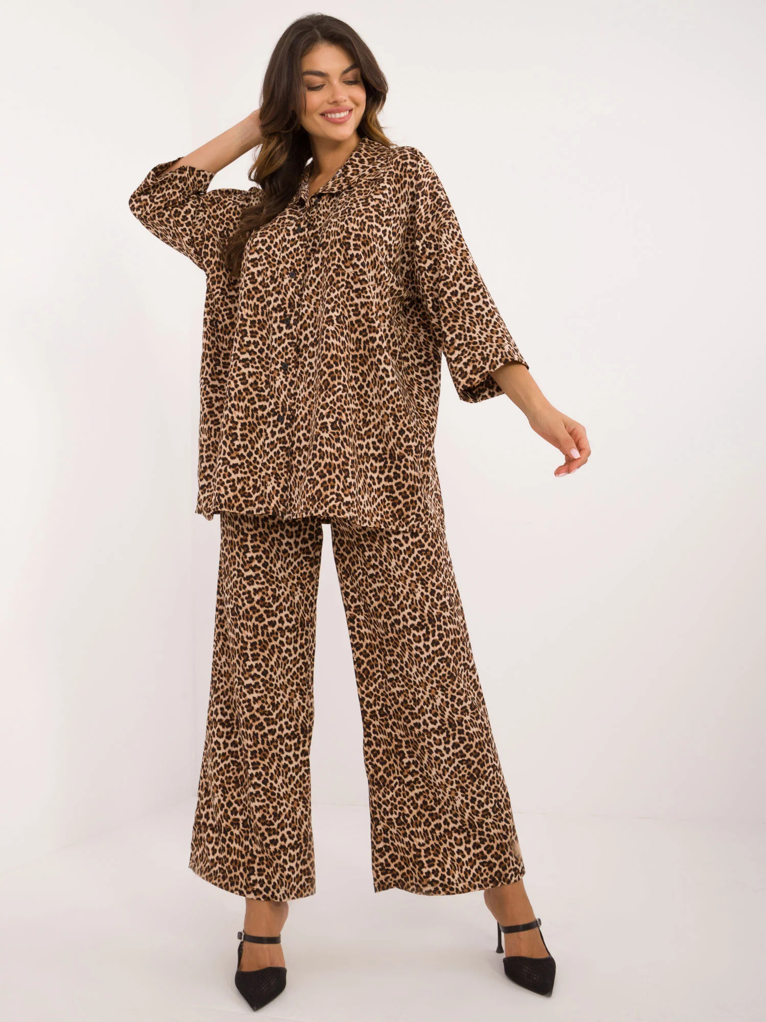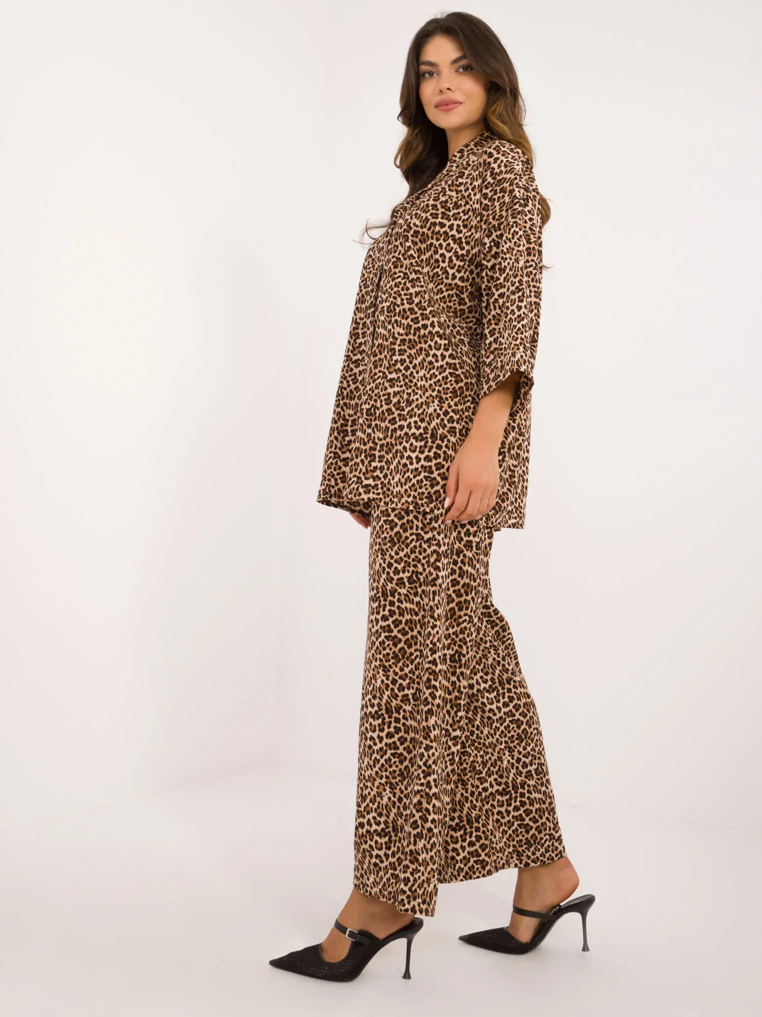 Rozměry soupravy ve velikosti S/M. měřeno na plocho: šířka košile v podpaží - 70 cm, délka rukávů - 47 cm, délka košile - 75 cm, šířka kalhot v pase - 34 cm, délka kalhot - 100 cm.