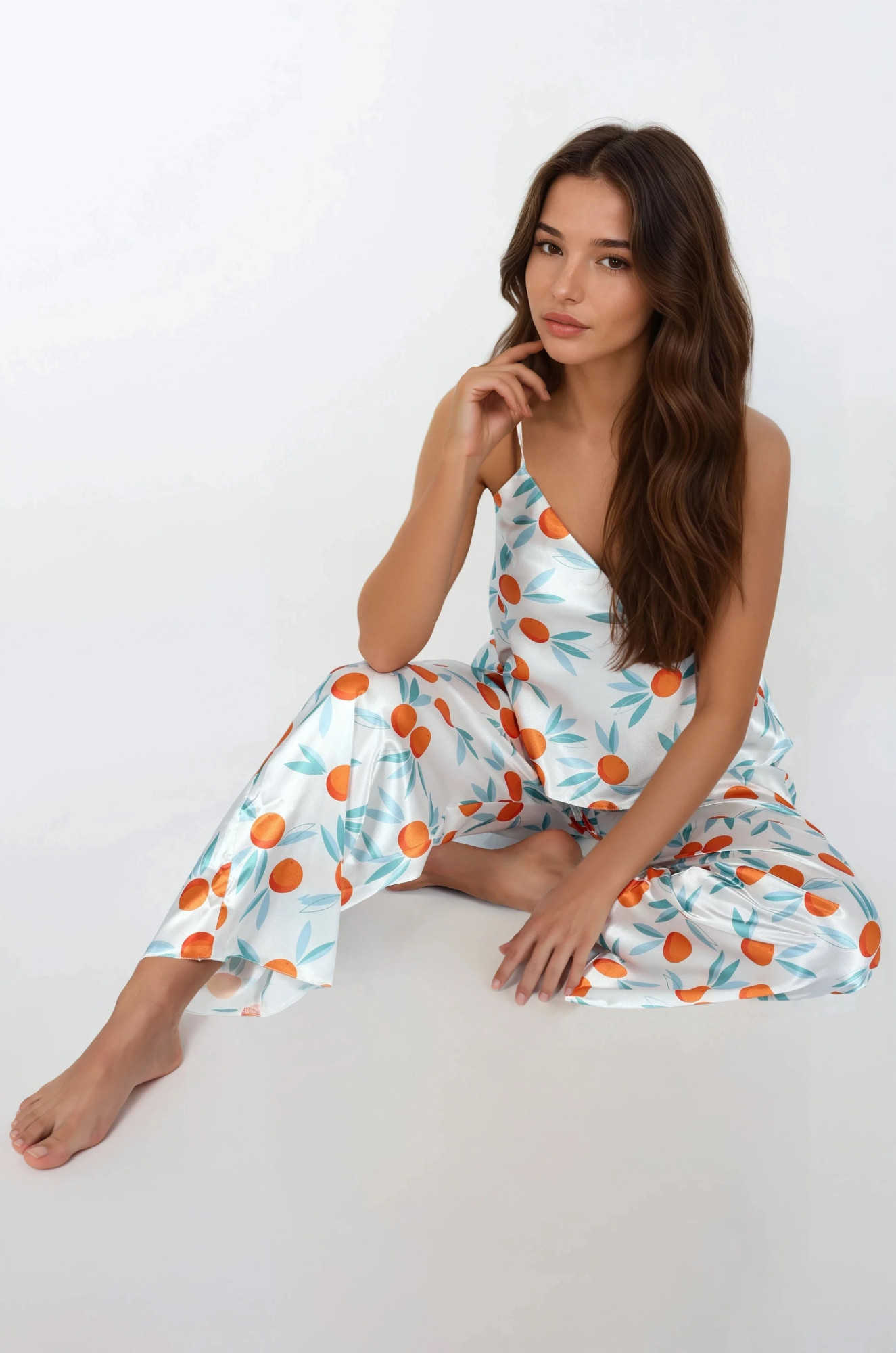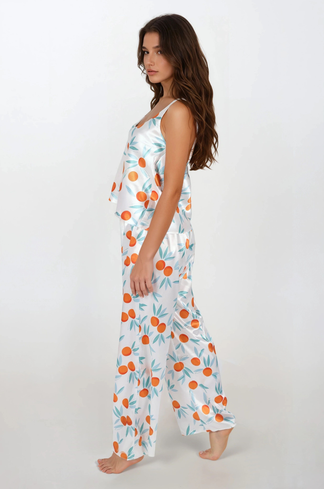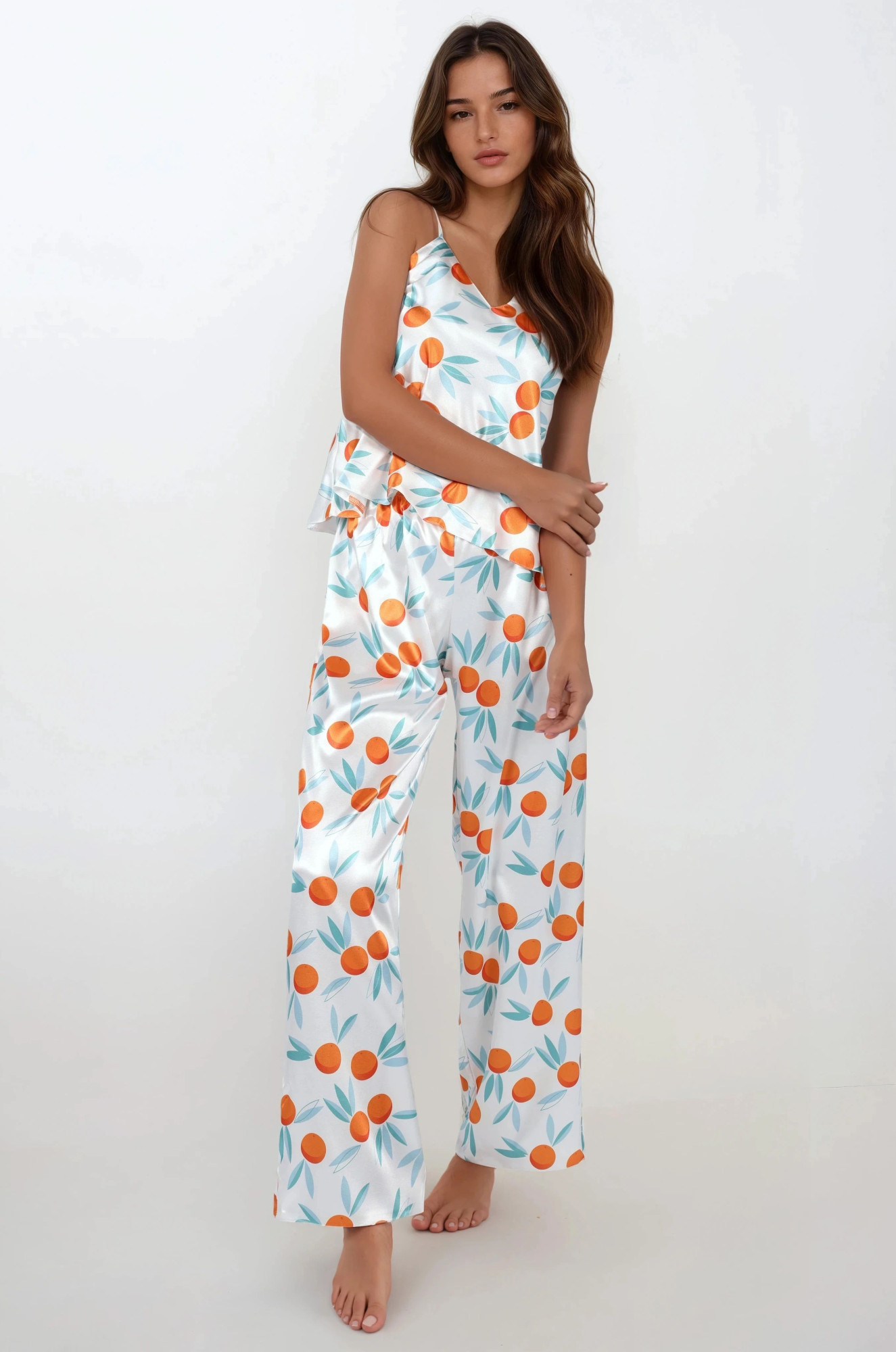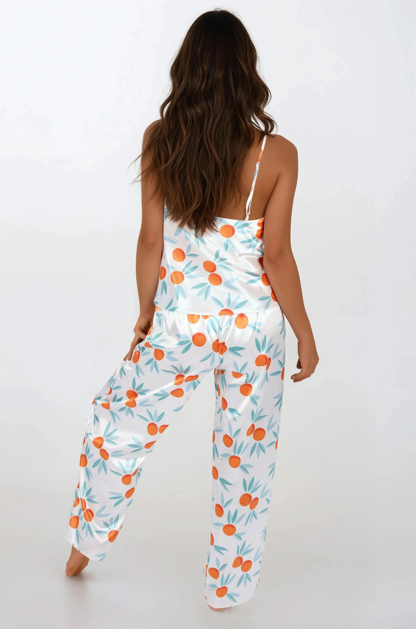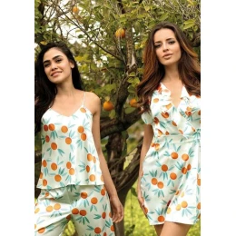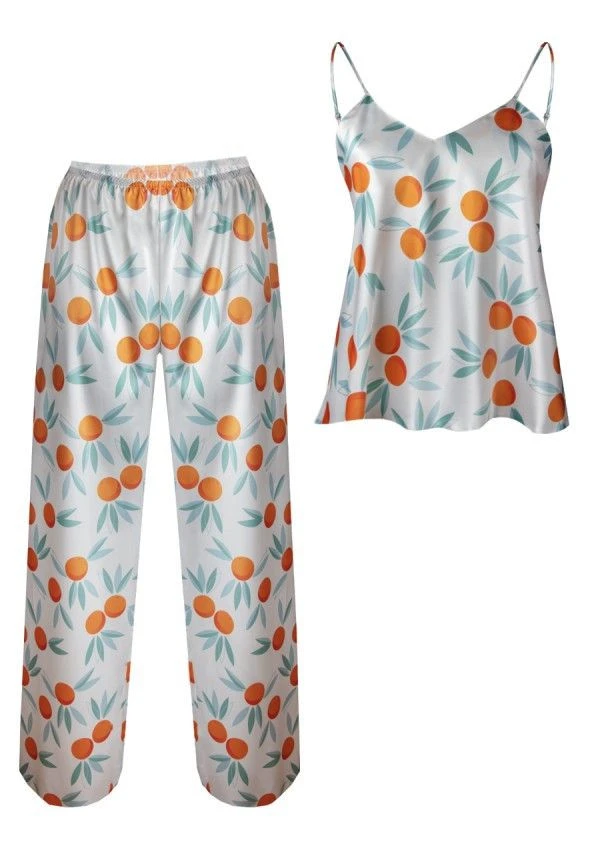 Pohodlné dvoudílné pyžamo z měkkého saténu s potiskem. Jsou navrženy tak, aby zdůrazňovaly linii poprsí, okouzlují jemným výstřihem a krásnými tenkými ramínky, jejichž délku lze nastavit. Dlouhé kalhoty s pohodlnými nohavicemi, v pase na měkkou gumu. Složení: 100% polyester.