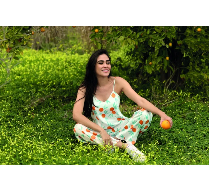 Pohodlné dvoudílné pyžamo z měkkého saténu s potiskem. Navrženo tak, aby zdůrazňovalo linii poprsí, okouzluje jemným výstřihem a krásnými tenkými ramínky, jejichž délku lze nastavit. Dlouhé kalhoty s pohodlnými nohavicemi, v pase na měkkou gumu. Složení: 100% polyester.