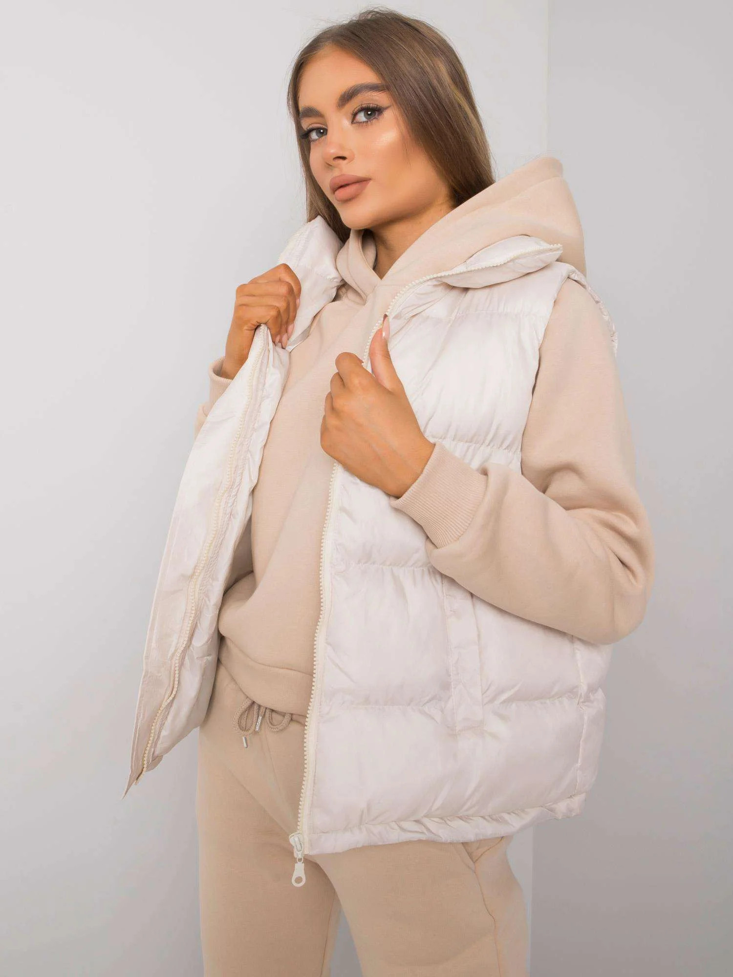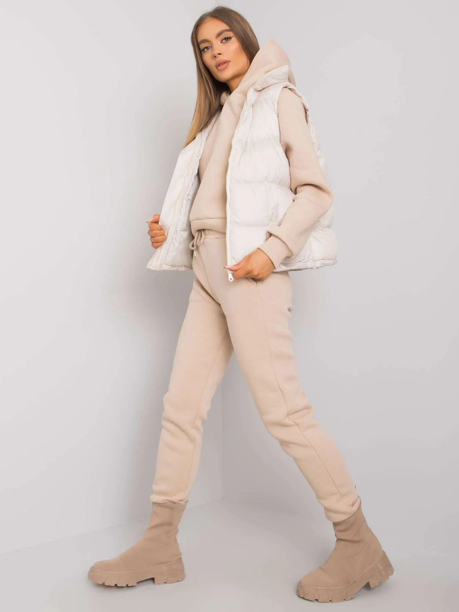Světle béžová třídílná dámská souprava.