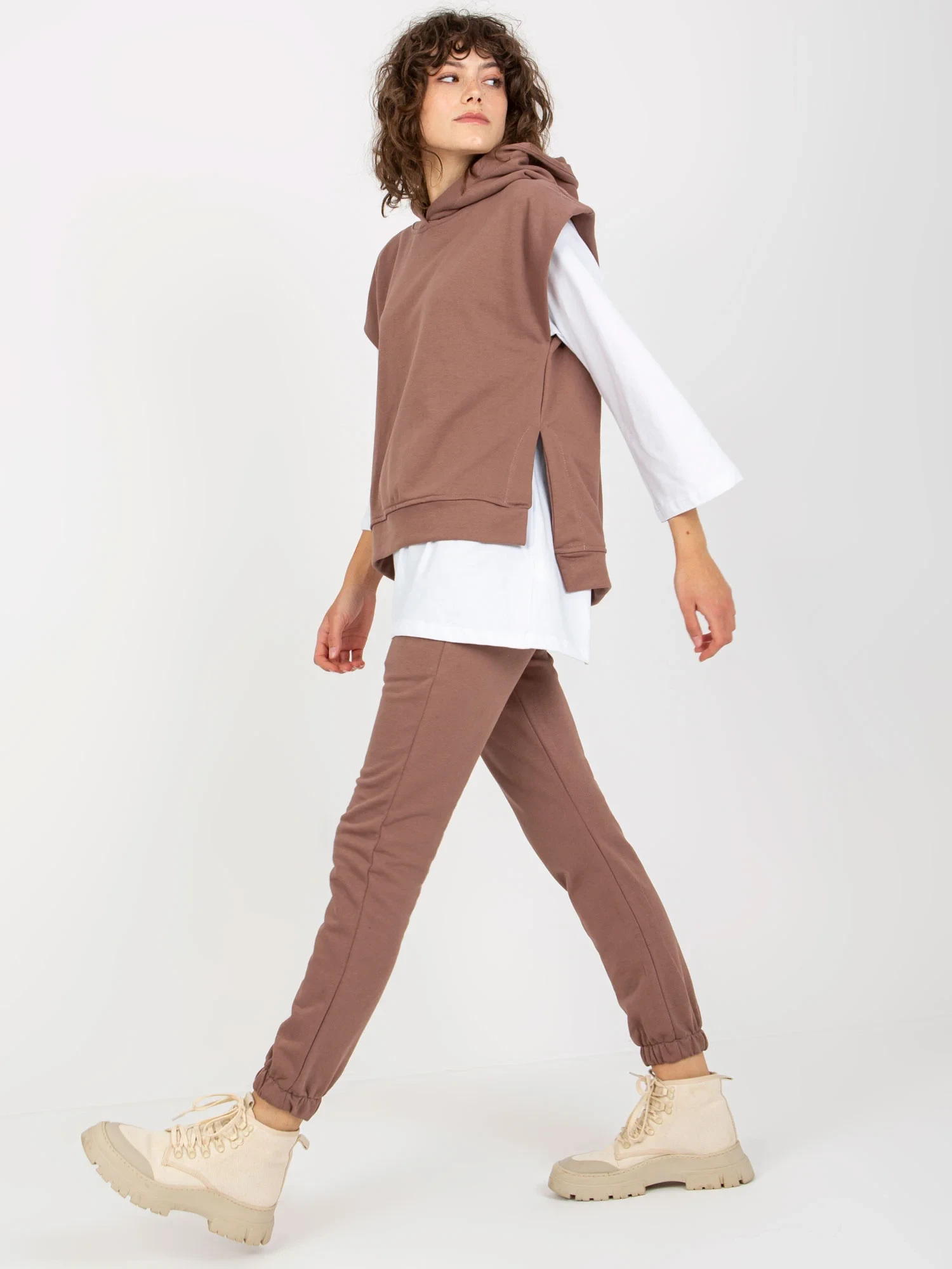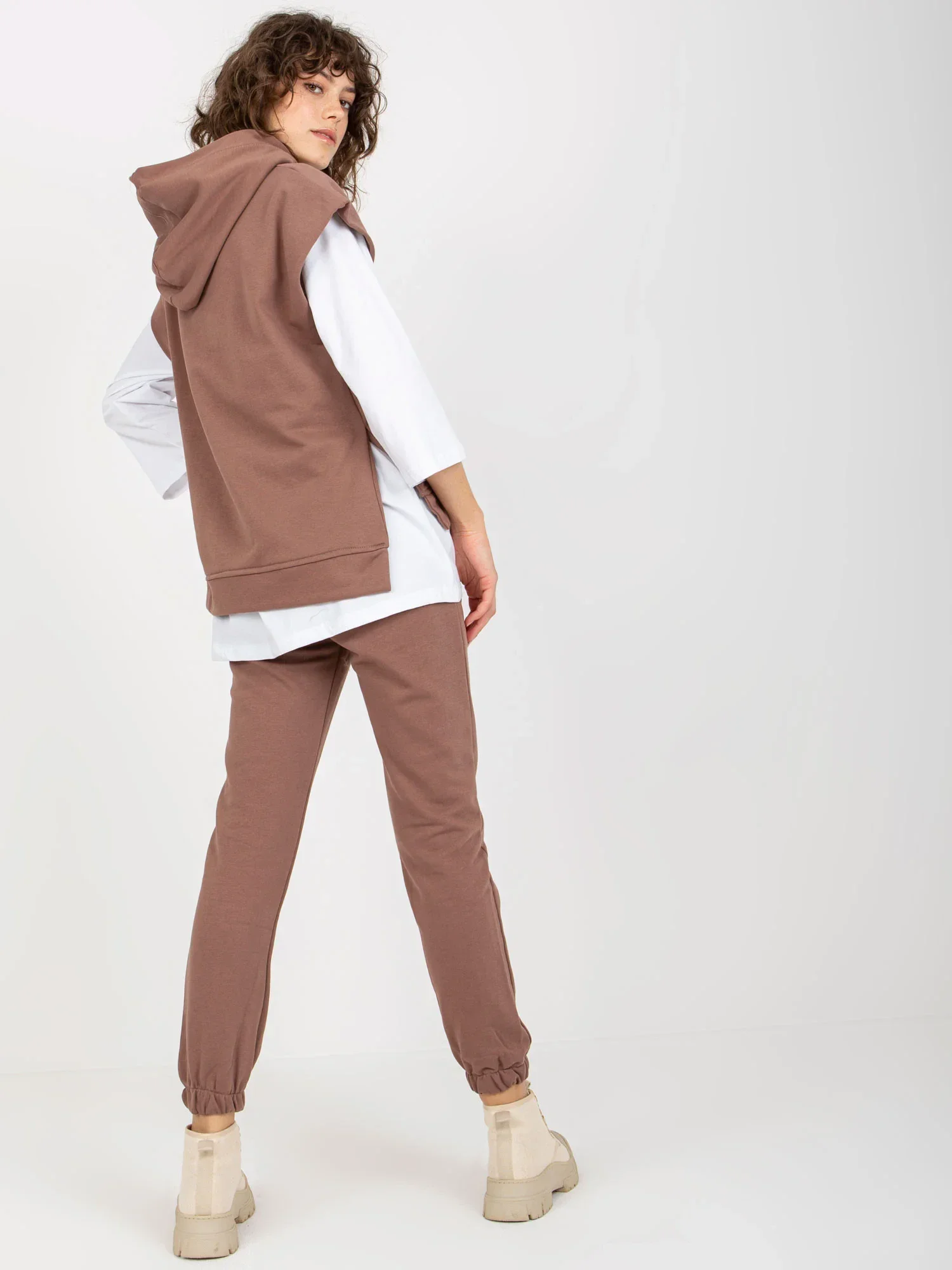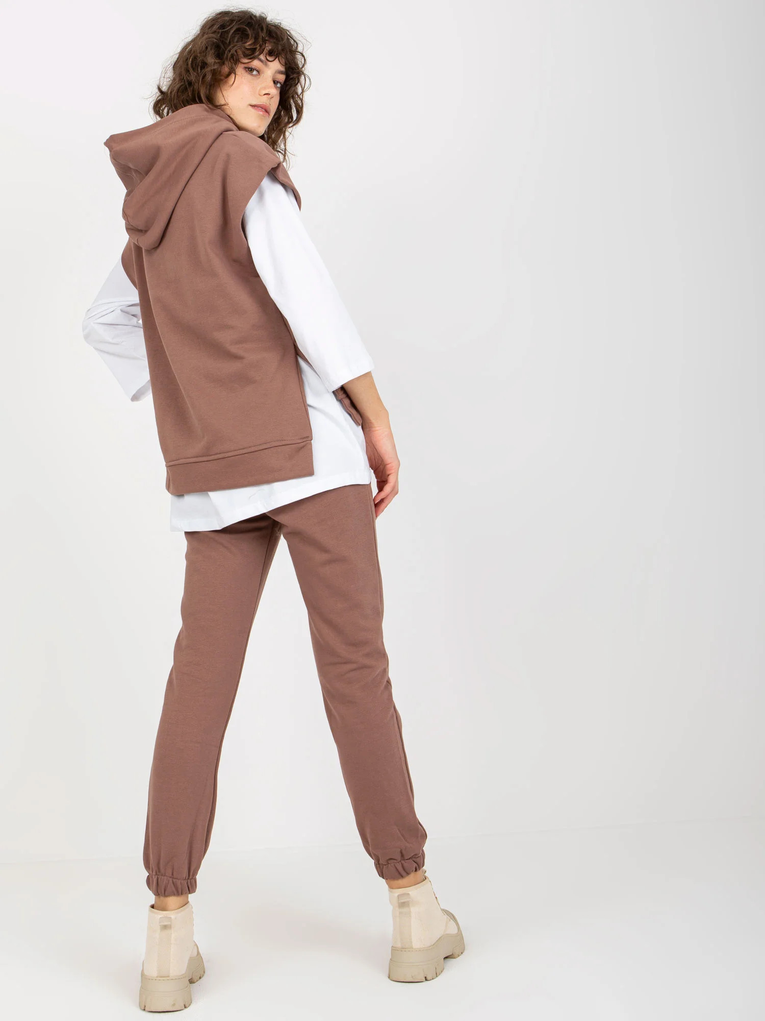 Hnědá třídílná souprava pro volný čas s kalhotami .