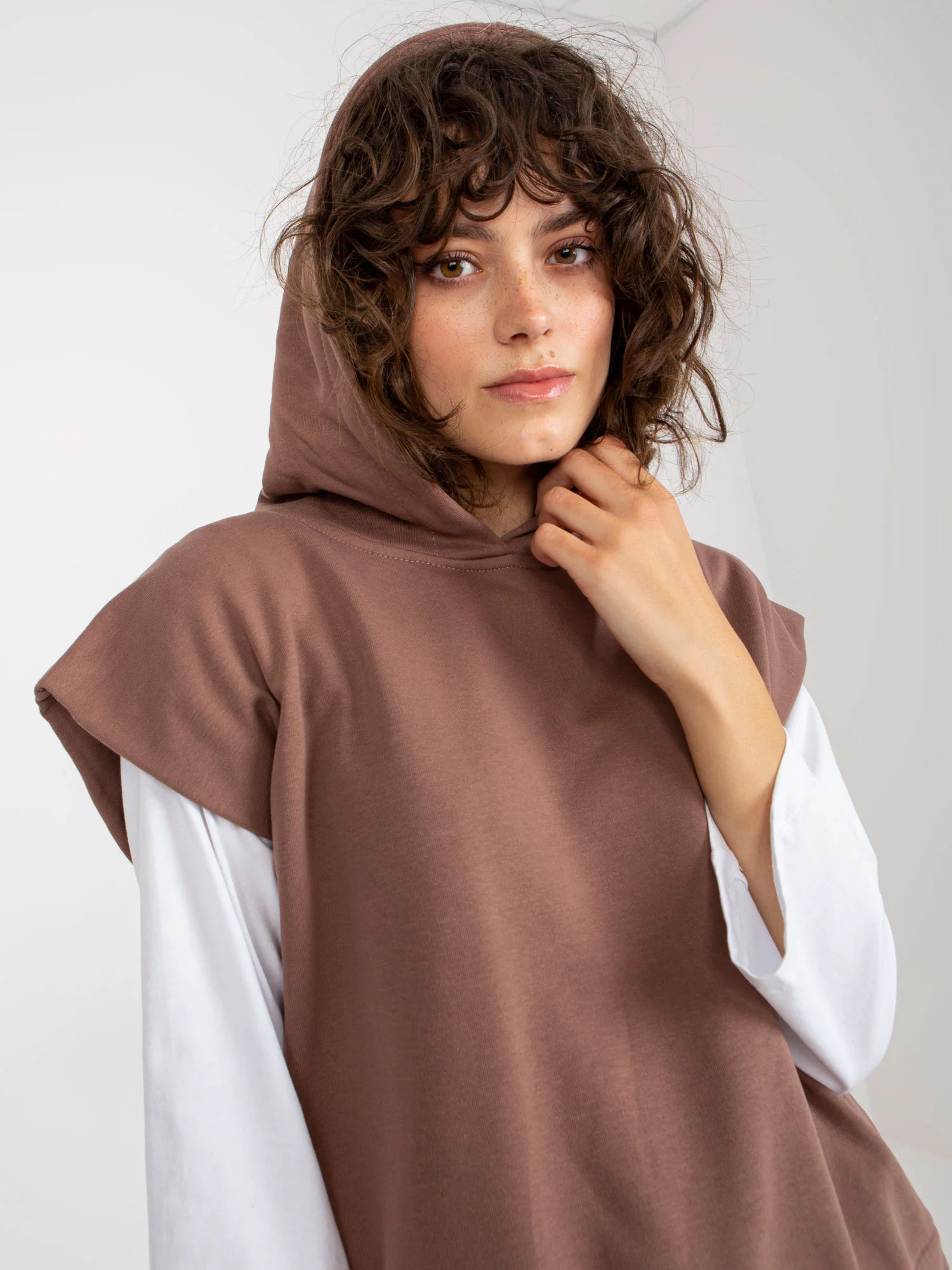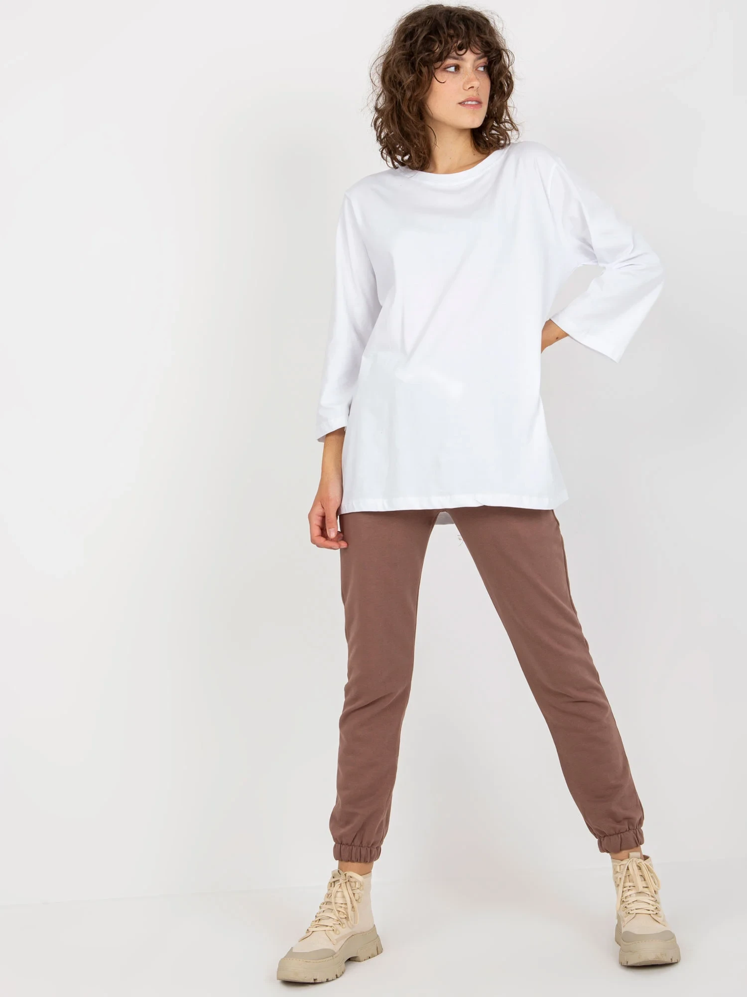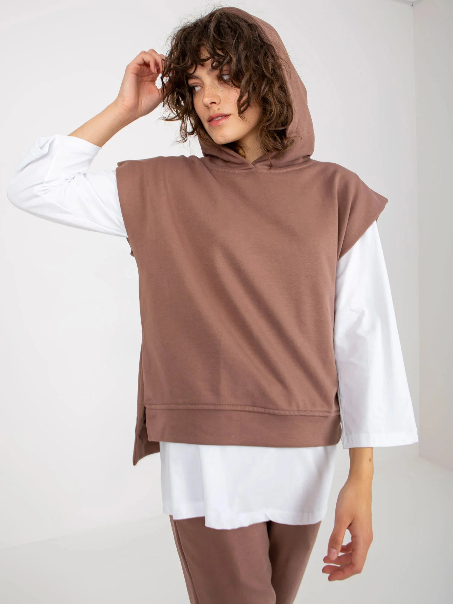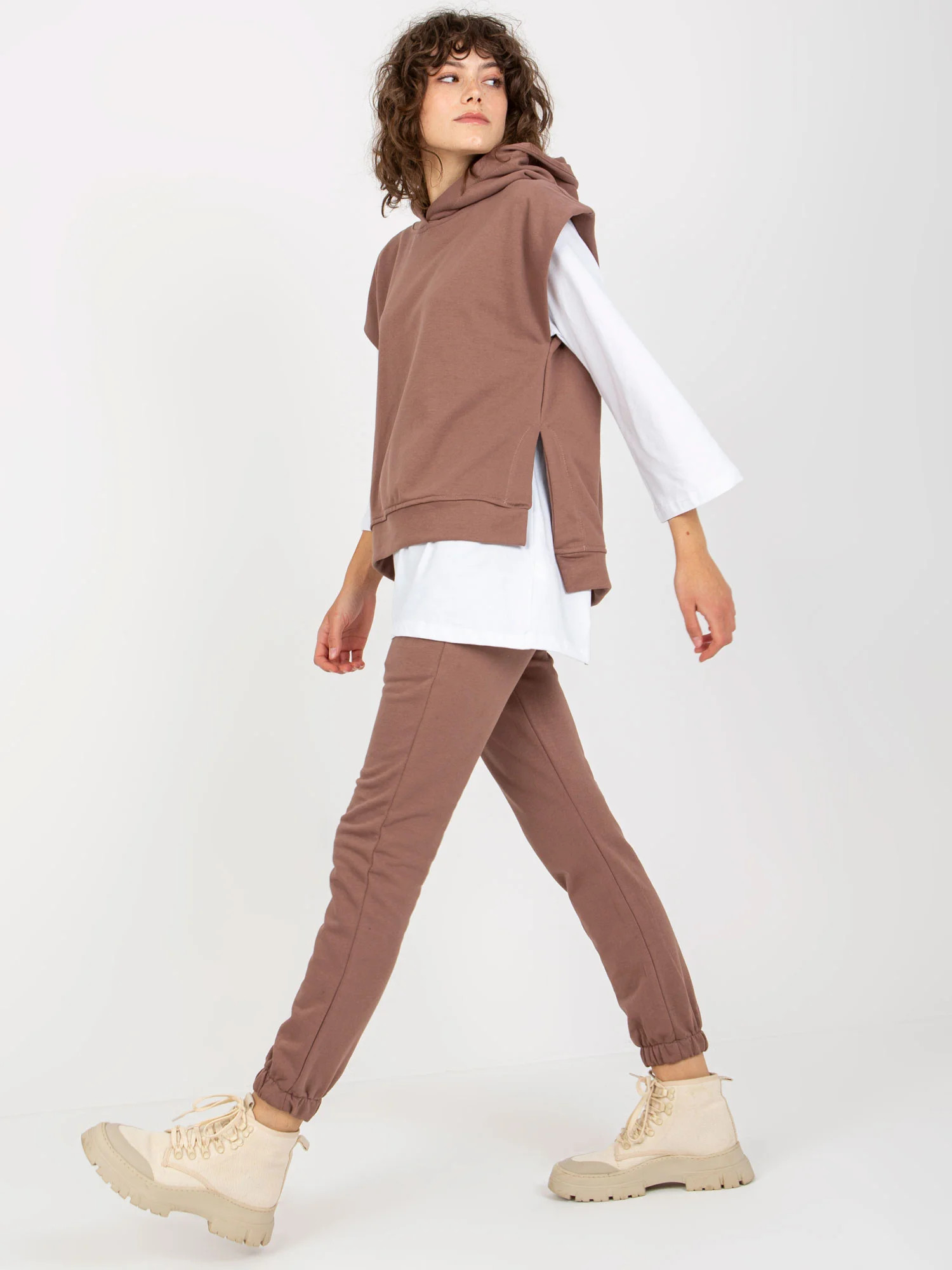 Hnědá třídílná souprava pro volný čas s kalhotami .
