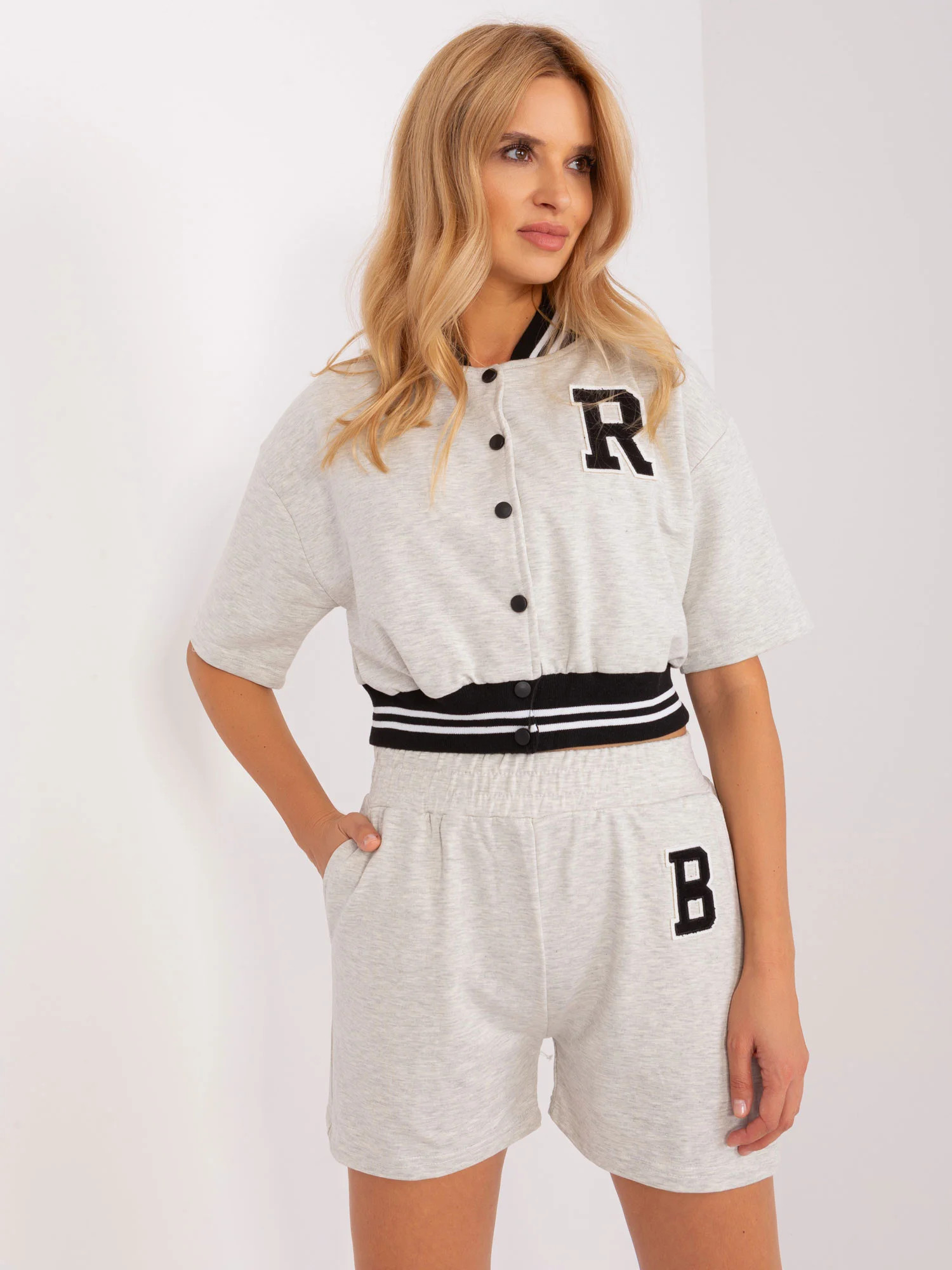 Světle šedá melanžová ležérní souprava s mikinou a šortkami.