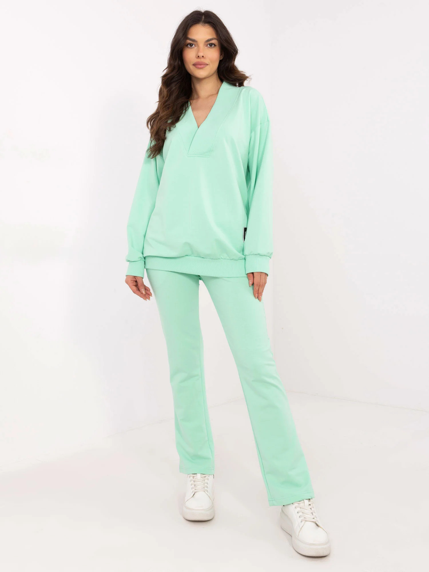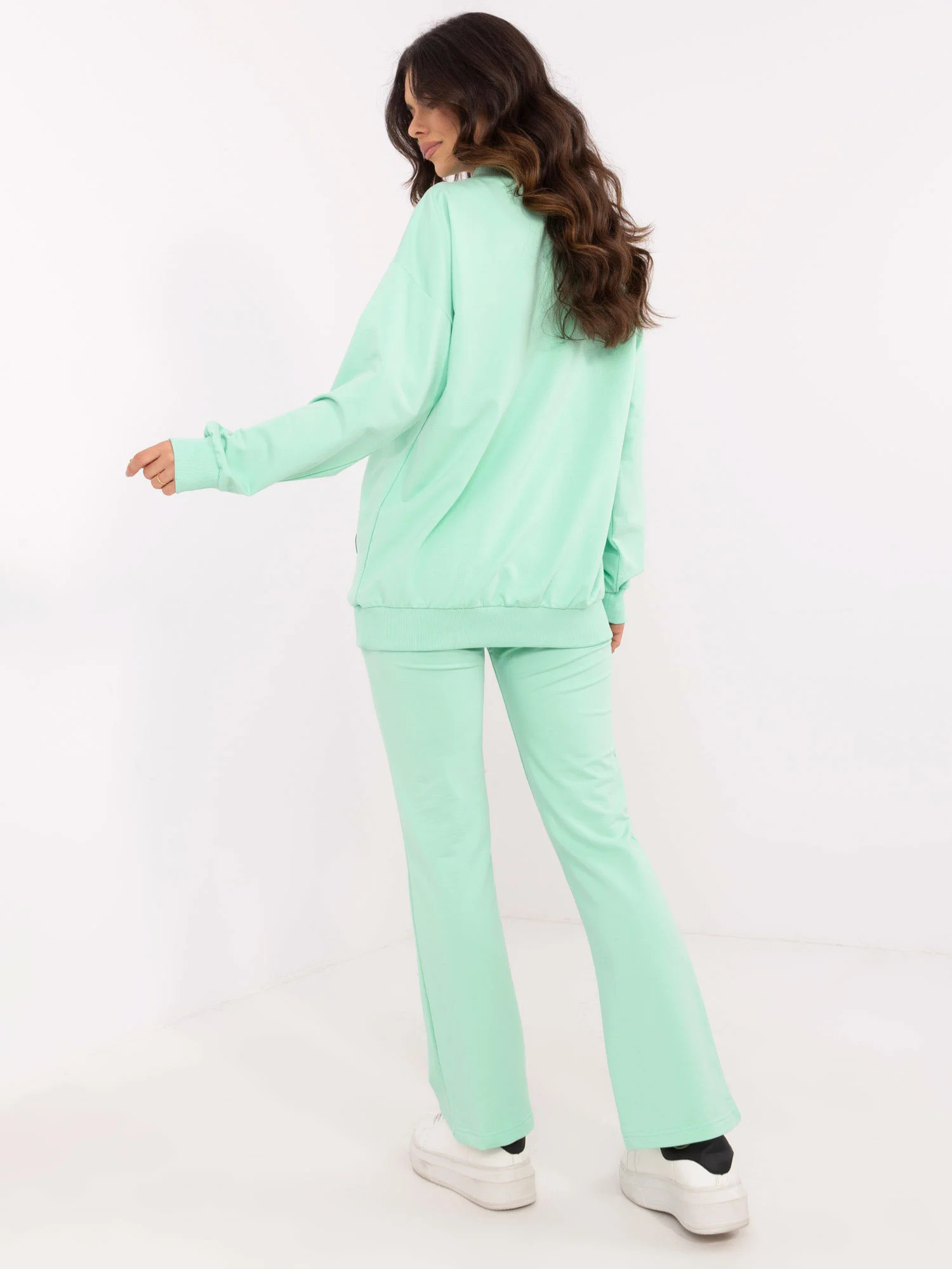 Wymiary bluzy w rozmiarze one size mierzone na płasko: szerokość bluzy pod pachami - 64 cm, długość bluzy - 74 cm, długość rękawa - 54 cm (od szwu), obwód w biodrach - 92 cm.