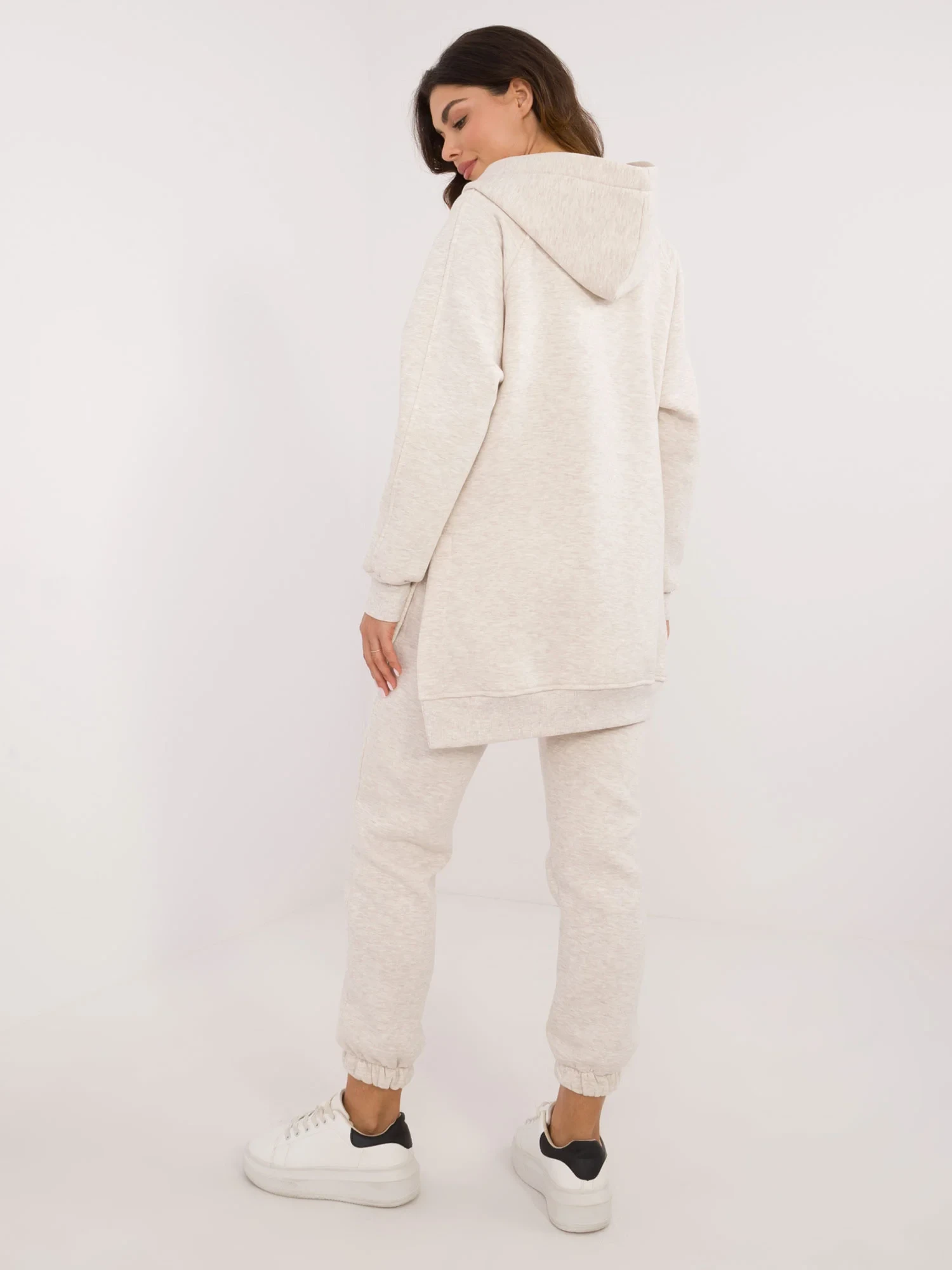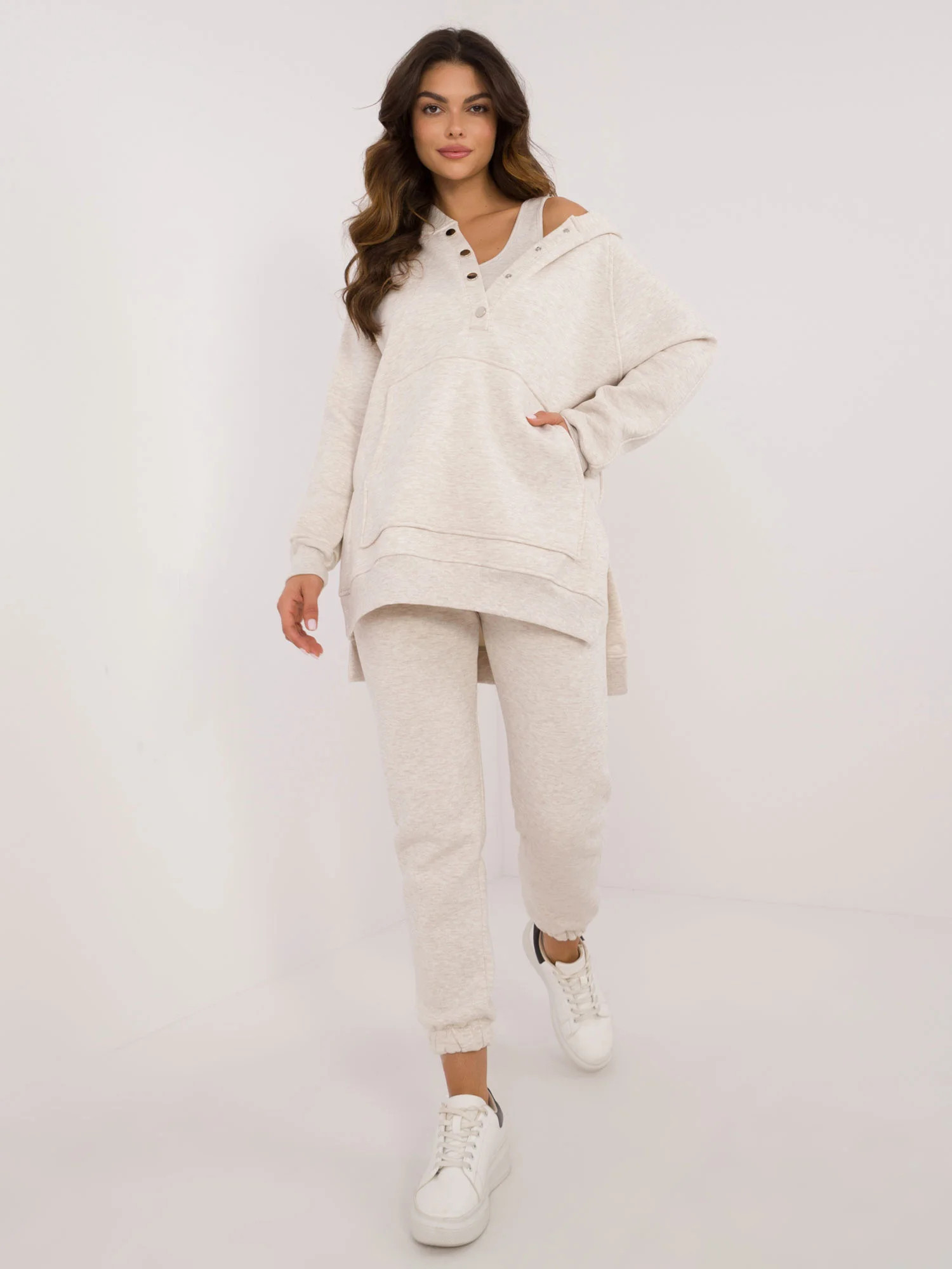 Rozměry kompletu v jedné velikosti měřené na plocho: šířka halenky v podpaží - 60 cm, délka halenky - 81 cm, délka rukávů - 60 cm, šířka topu v podpaží - 38 cm, délka topu - 42 cm, šířka kalhot v pase - 34 cm, délka kalhot - 96 cm.