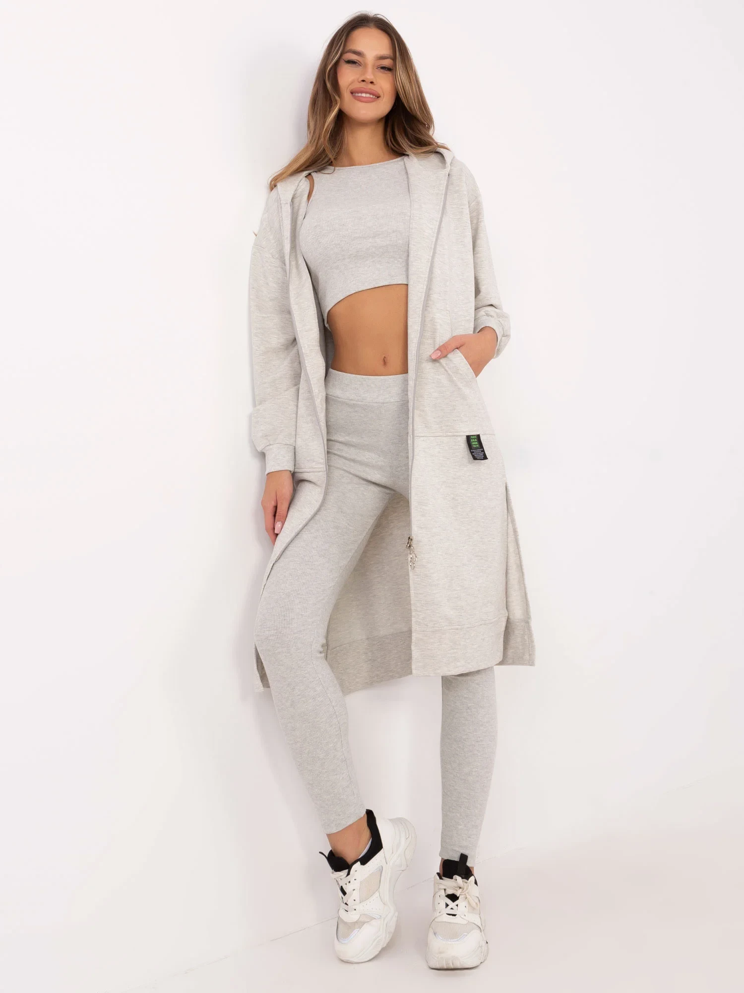 složení materiálu halenky: 72 % bavlna, 22 % polyester, 6 % elastan; složení materiálu legín a topu: 90 % bavlna, 10 % elastan