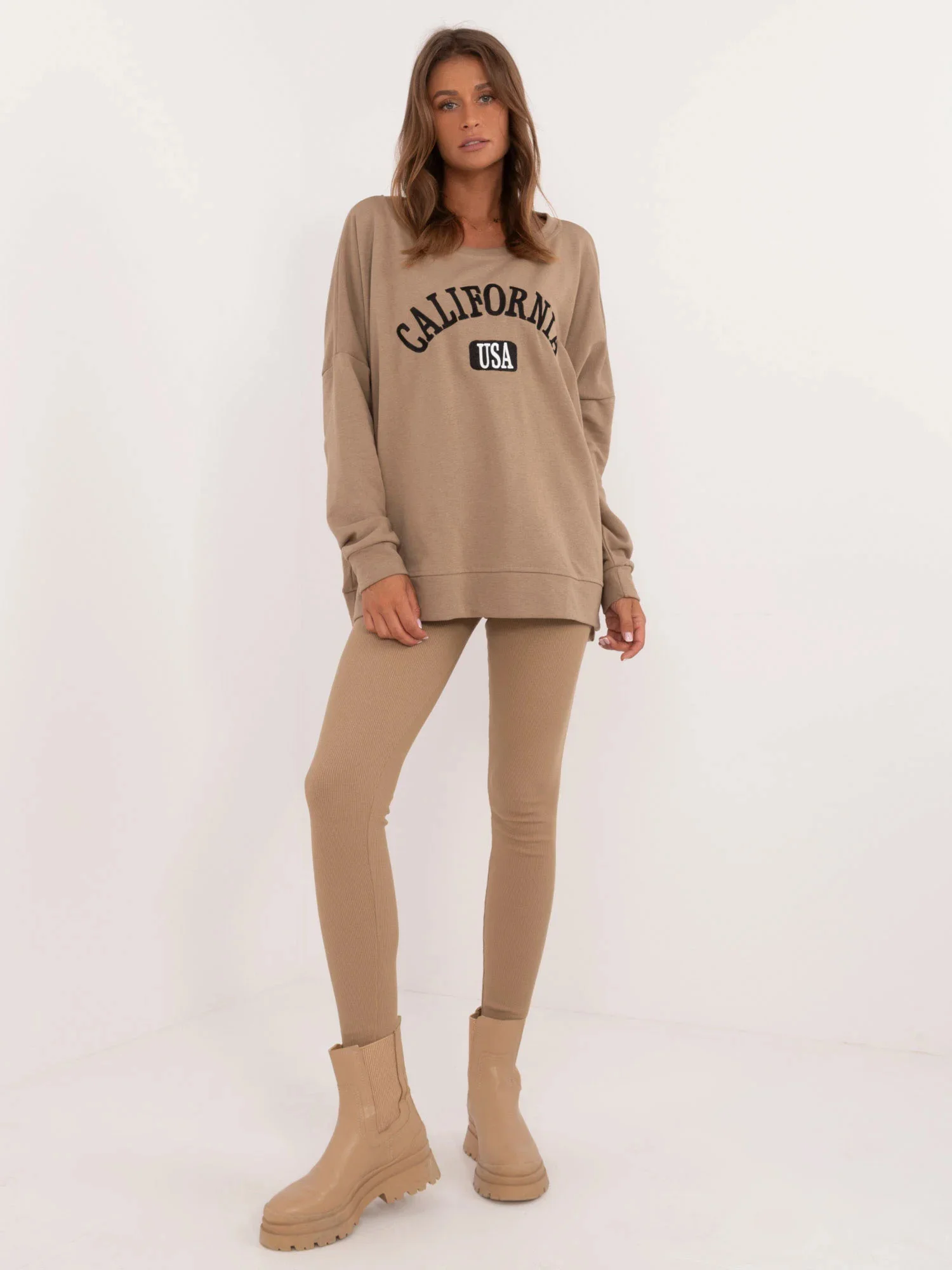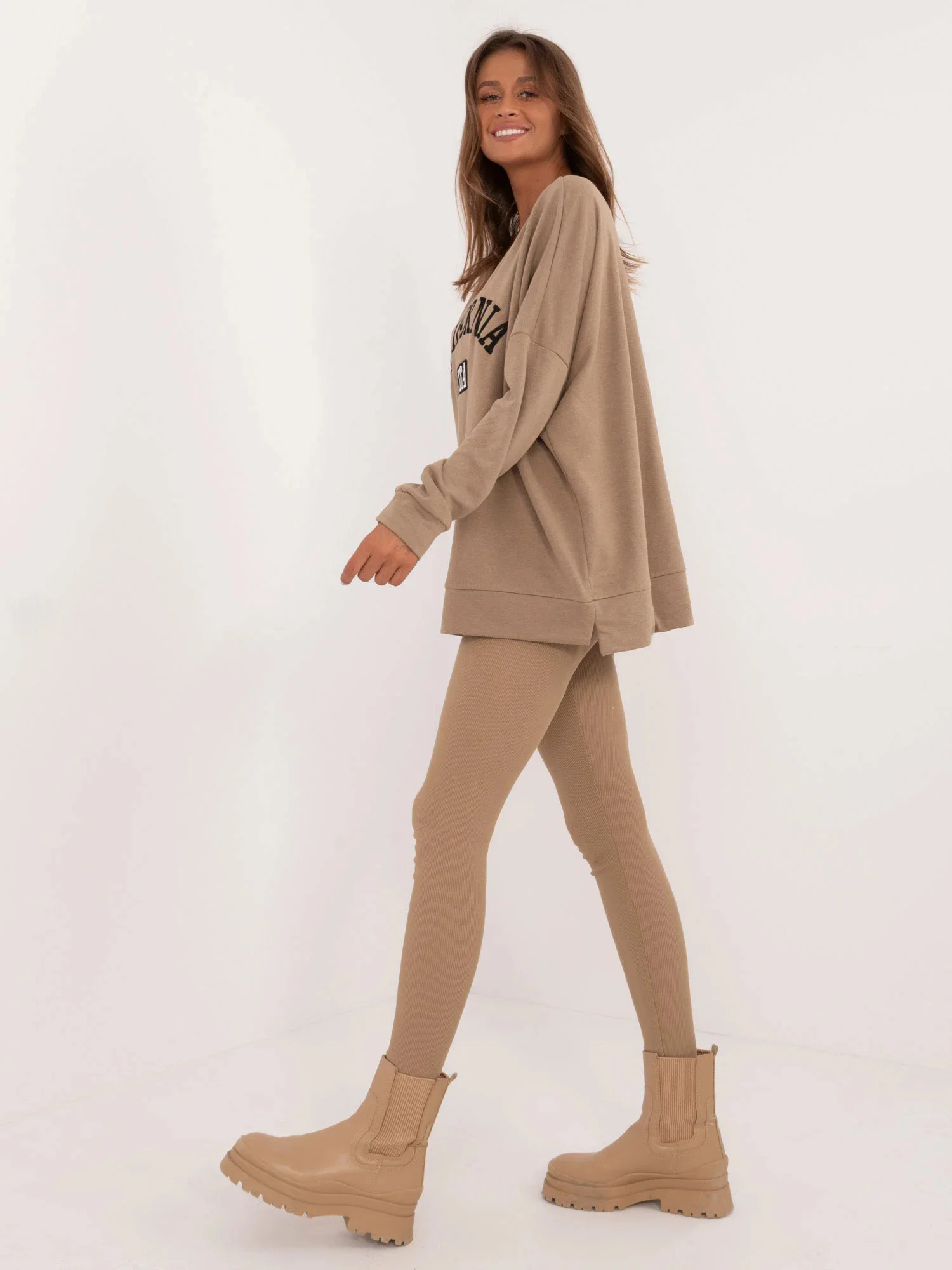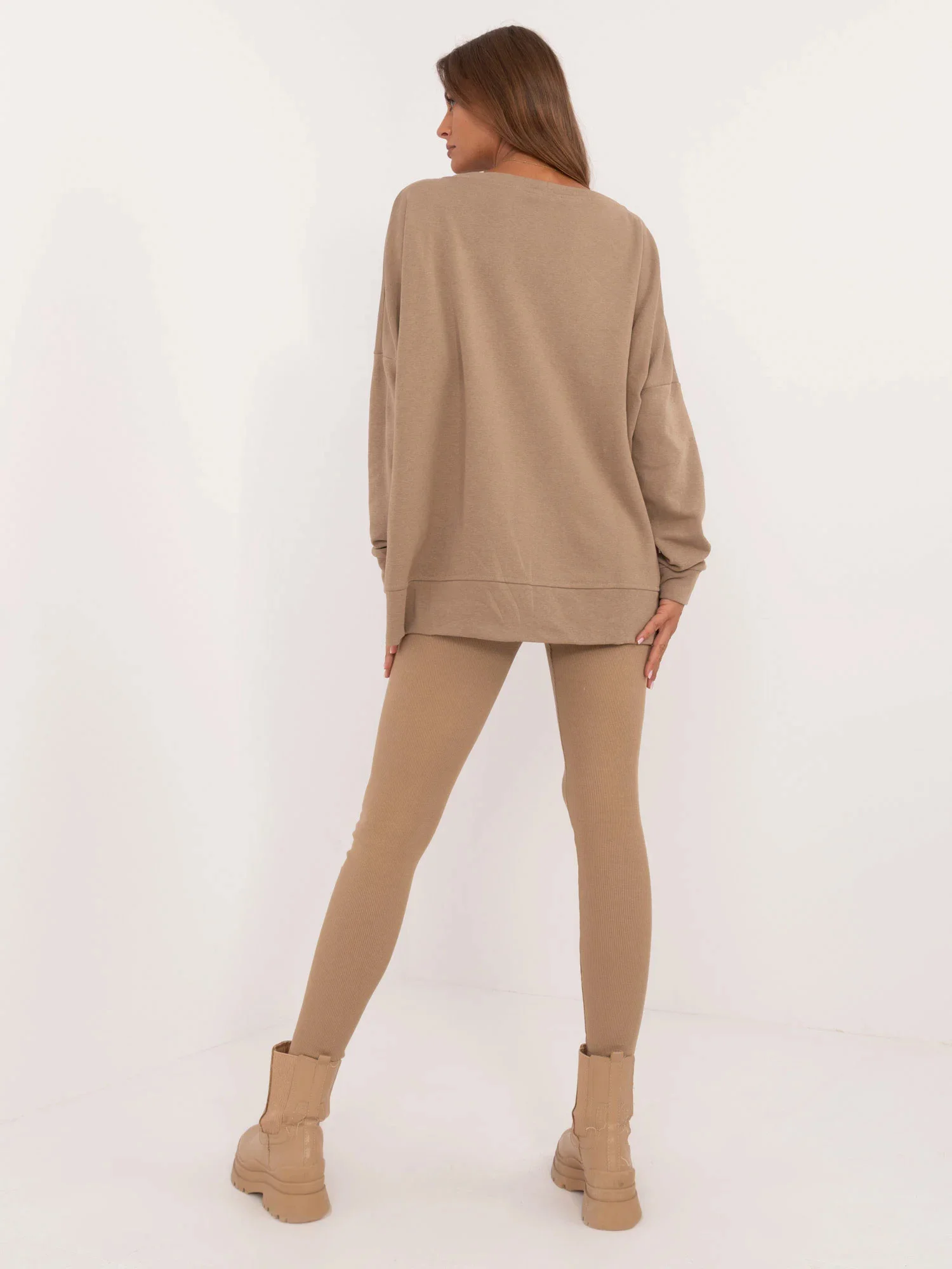 Rozměry soupravy v jedné velikosti měřené na plocho: šířka halenky v podpaží - 78 cm, délka rukávů - 61 cm, délka halenky - 70 cm, šířka legín v pase - 30 cm, výška pasu - 31 cm, délka legín - 99 cm.