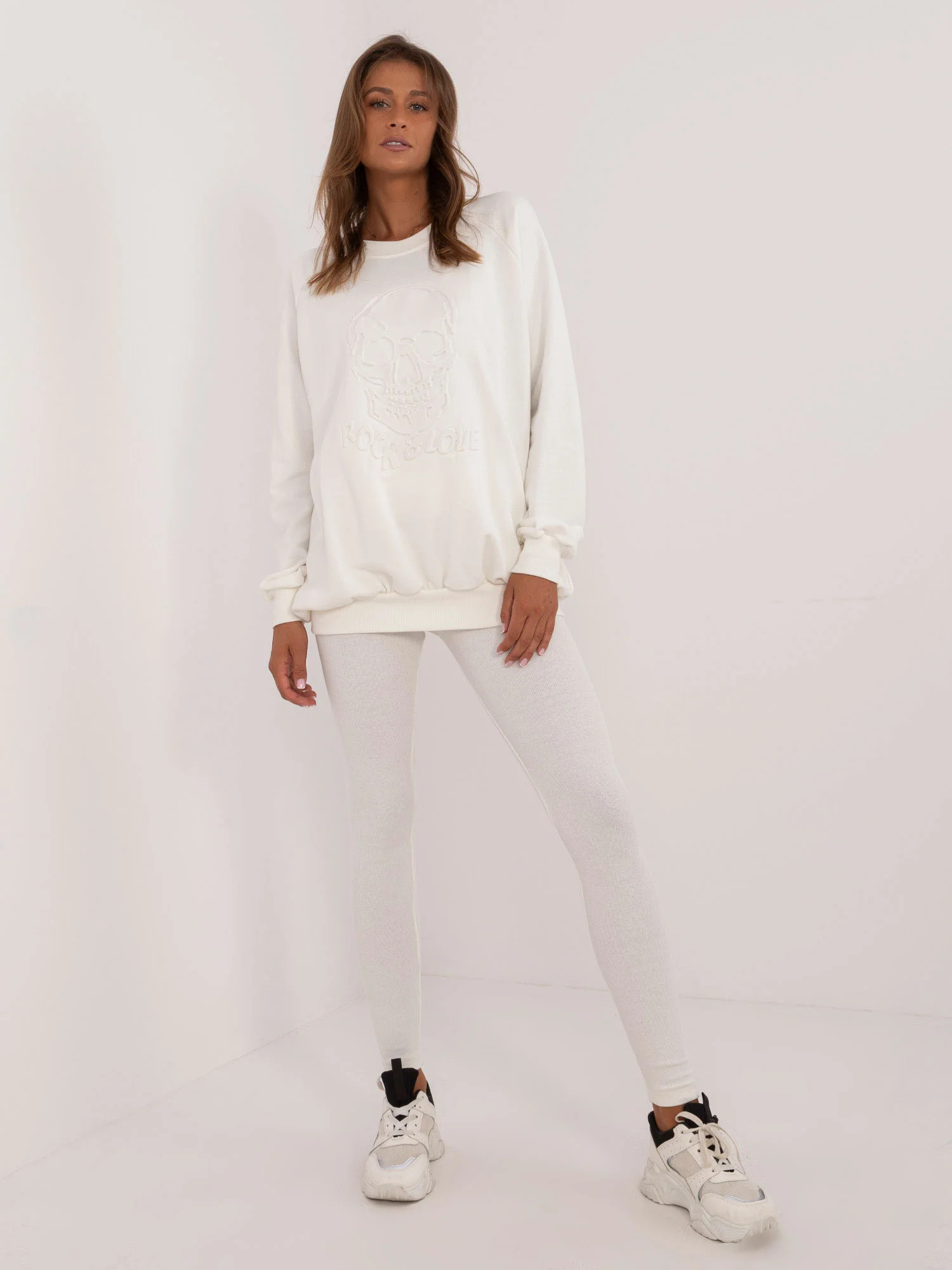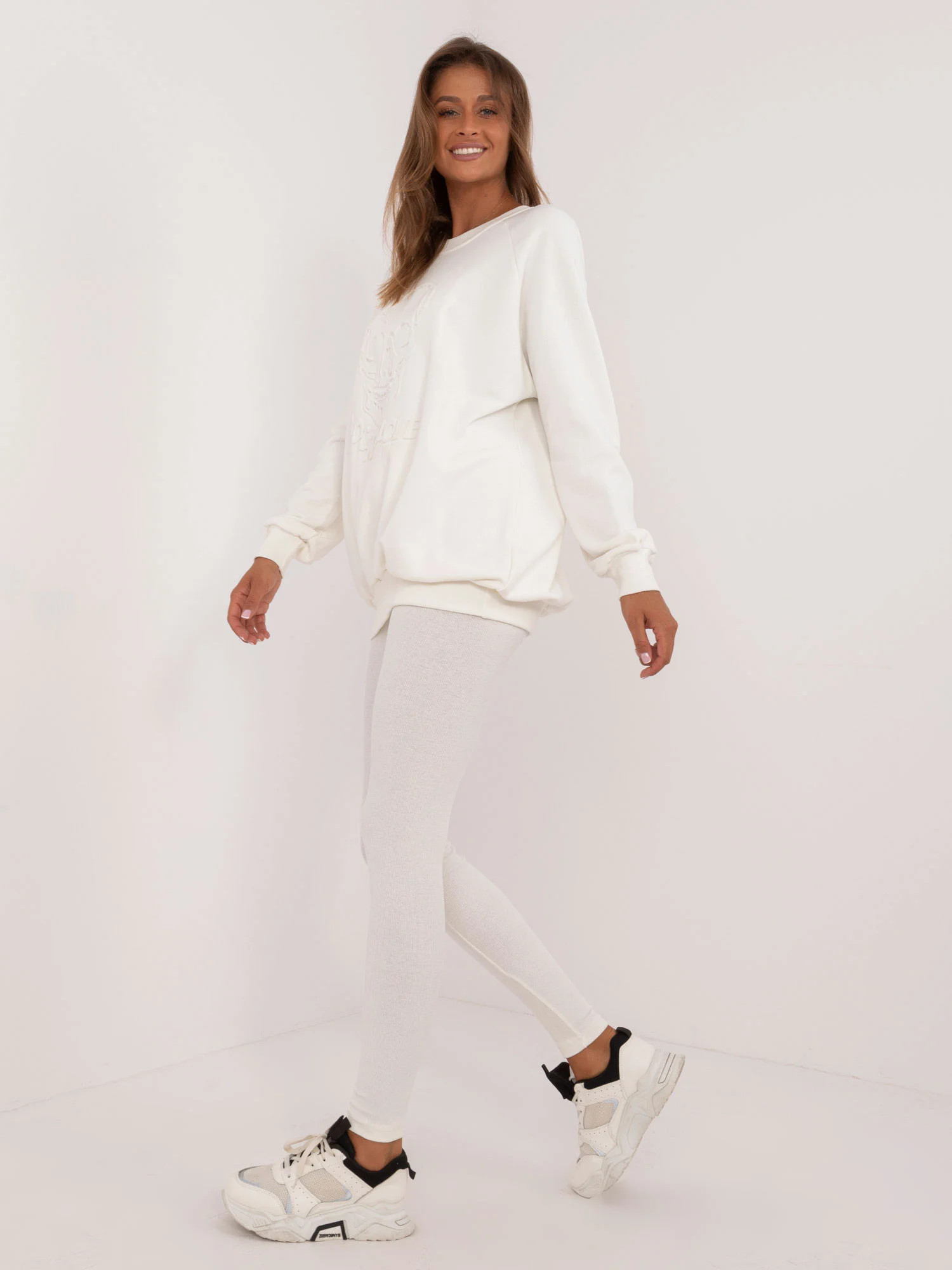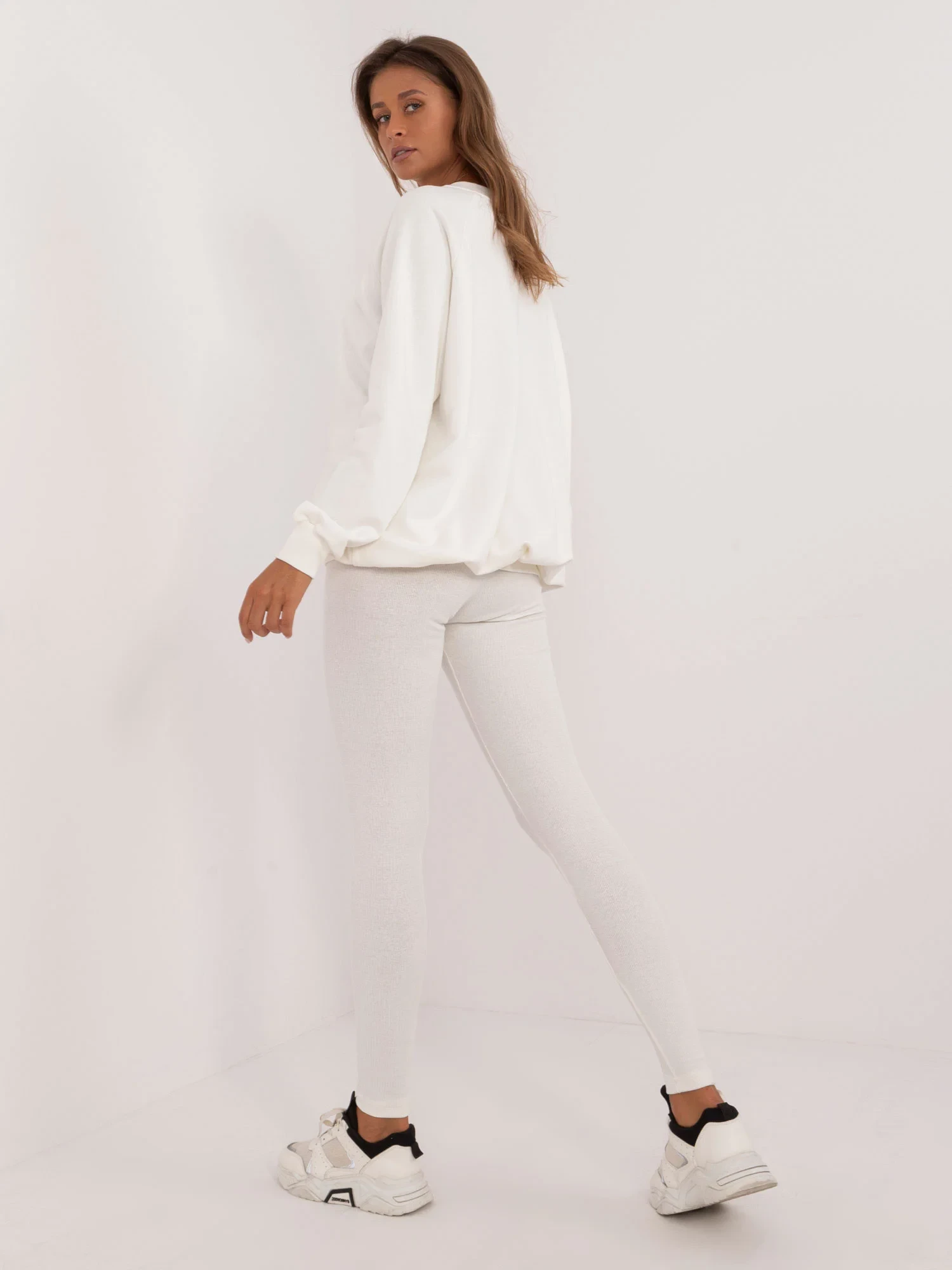 Rozměry soupravy v jedné velikosti měřené na plocho: šířka halenky v podpaží - 70 cm, délka halenky - 74 cm, délka rukávů - 64 cm, šířka legín v pase - 30 cm, výška pasu - 28 cm, délka legín - 98 cm.