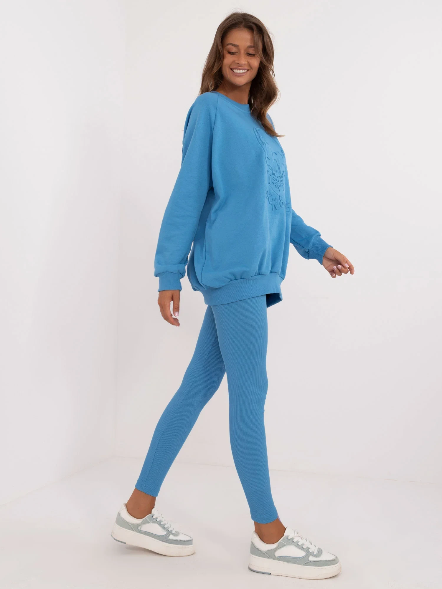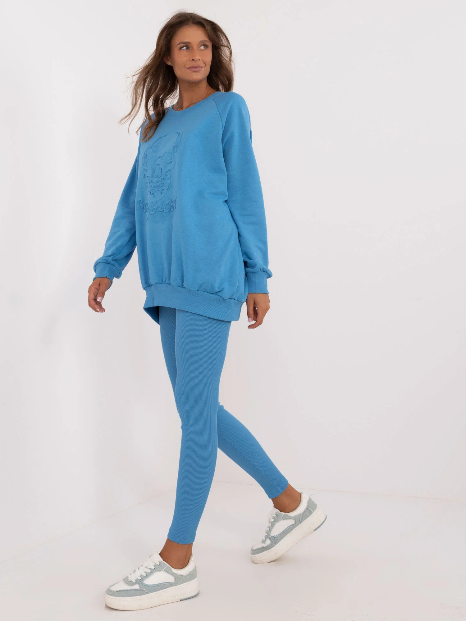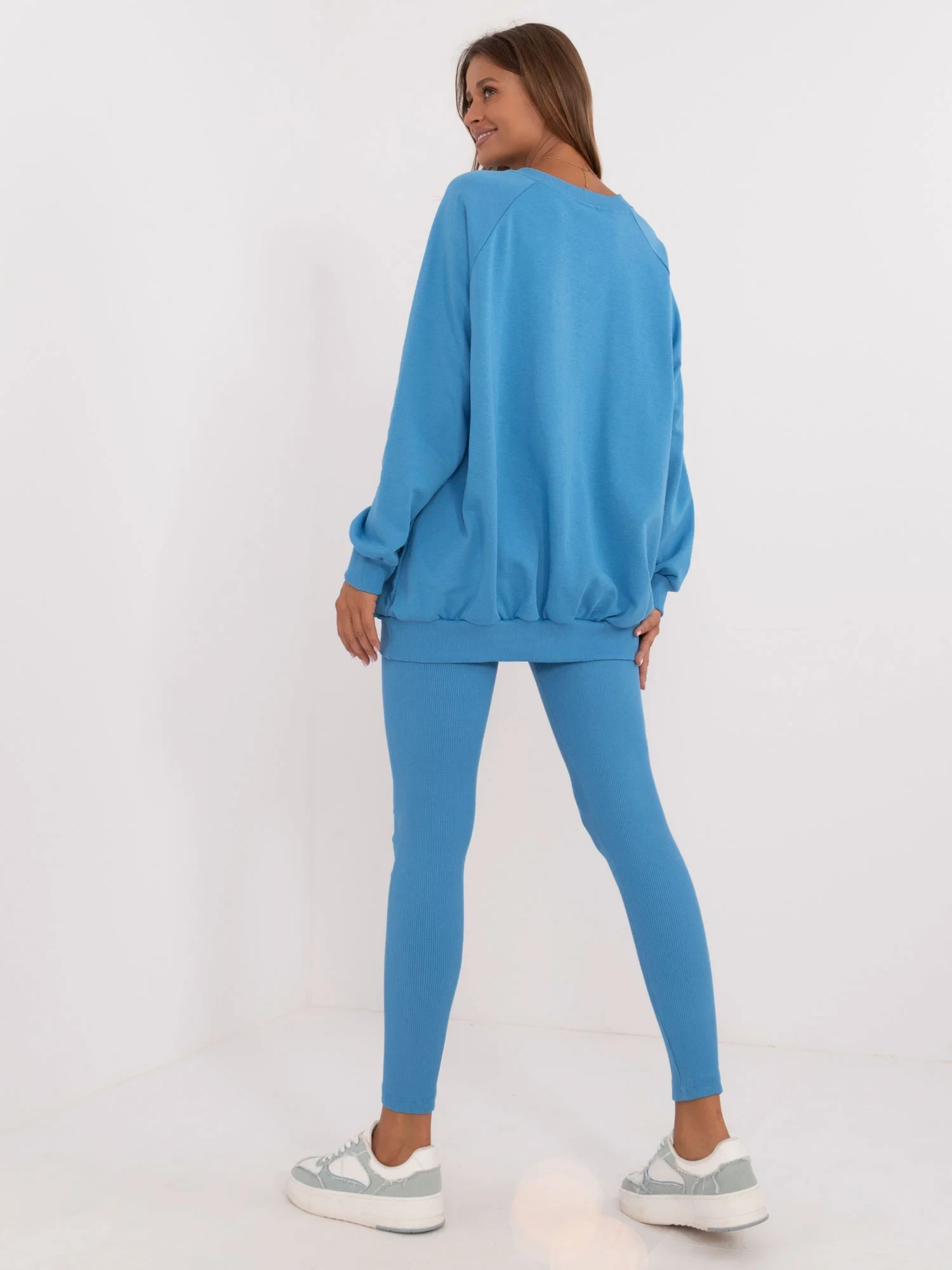 Rozměry soupravy v jedné velikosti měřené na plocho: šířka halenky v podpaží - 70 cm, délka halenky - 74 cm, délka rukávů - 64 cm, šířka legín v pase - 30 cm, výška pasu - 28 cm, délka legín - 98 cm.