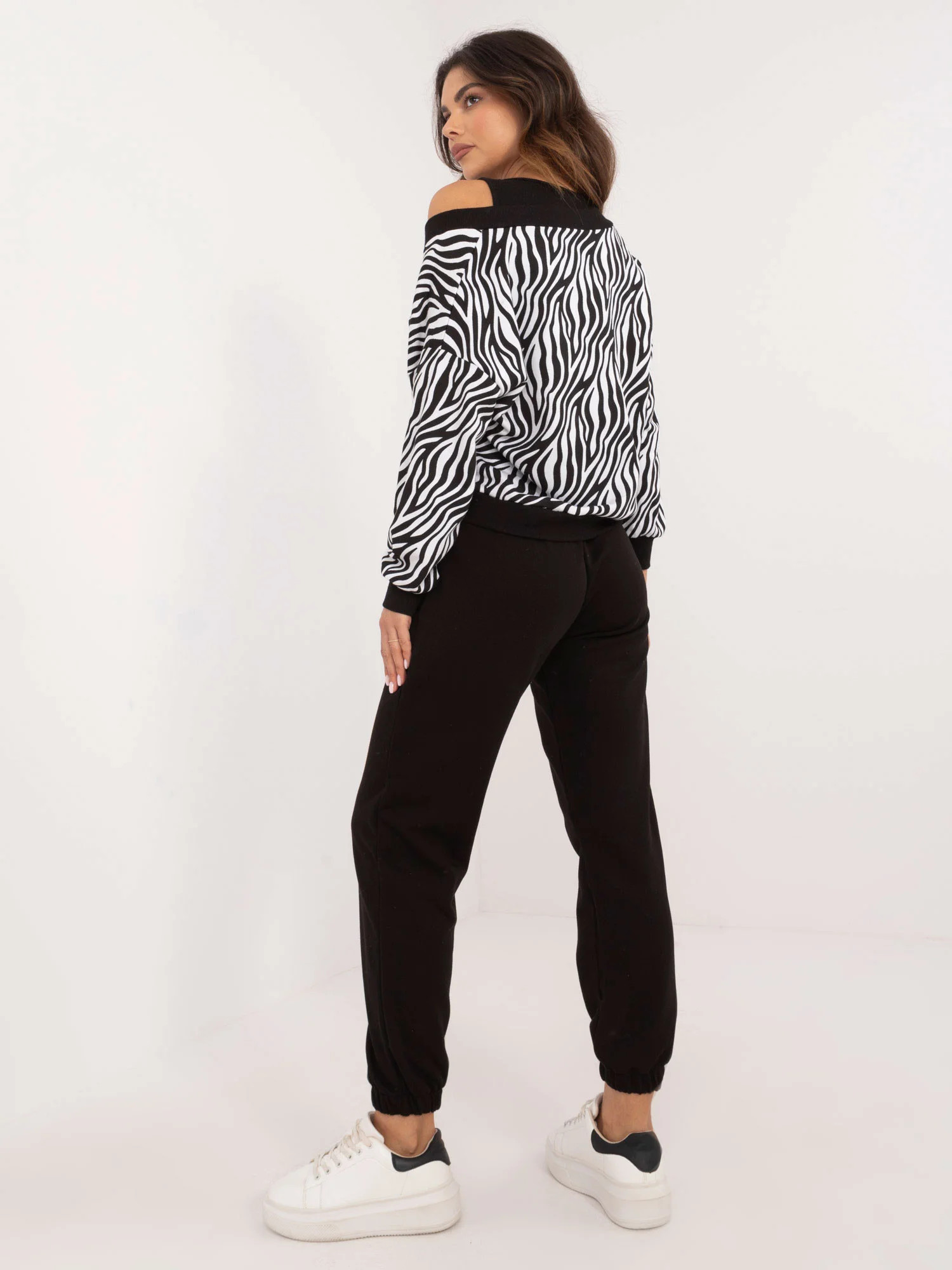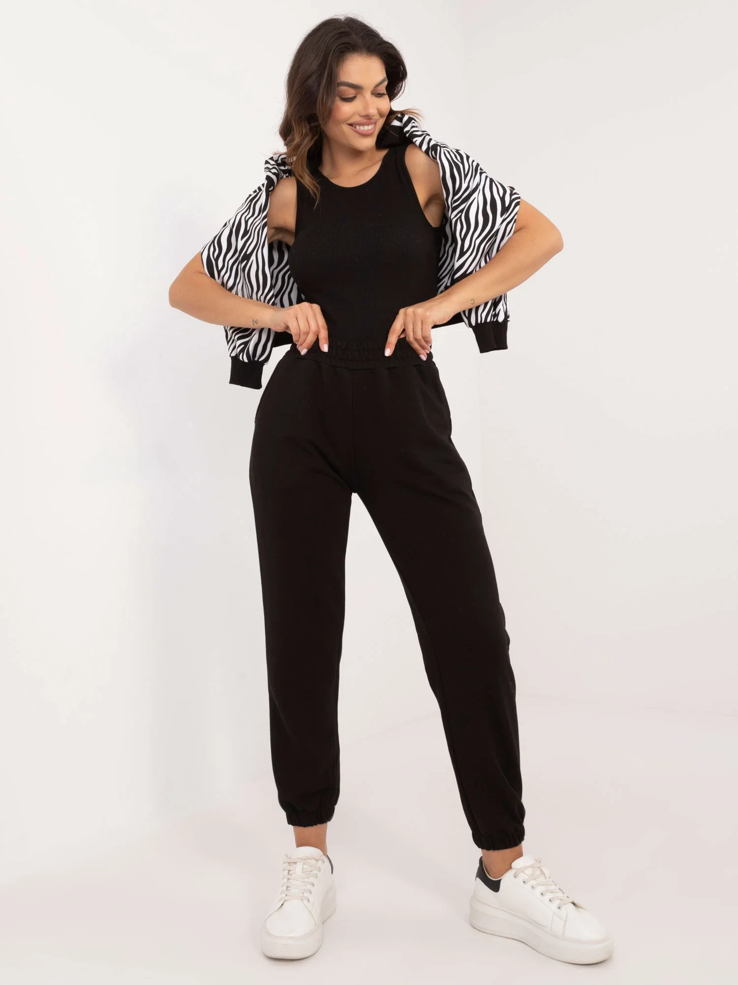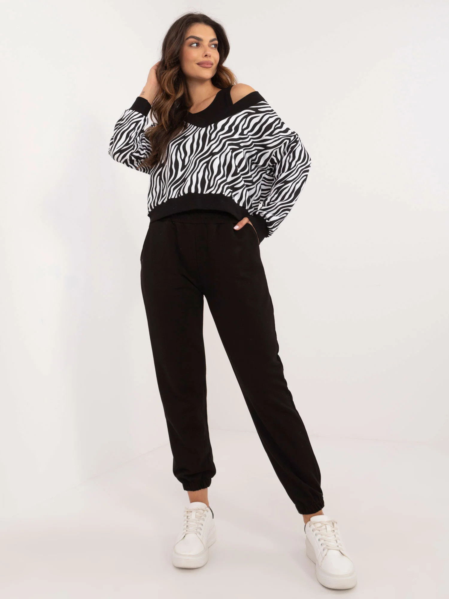 Rozměry soupravy v jedné velikosti měřené na plocho: šířka halenky v podpaží - 58 cm, délka halenky - 52 cm, délka rukávů - 55 cm, šířka topu v podpaží - 40 cm, délka topu - 49 cm, šířka kalhot v pase - 34 cm, délka kalhot - 96 cm.