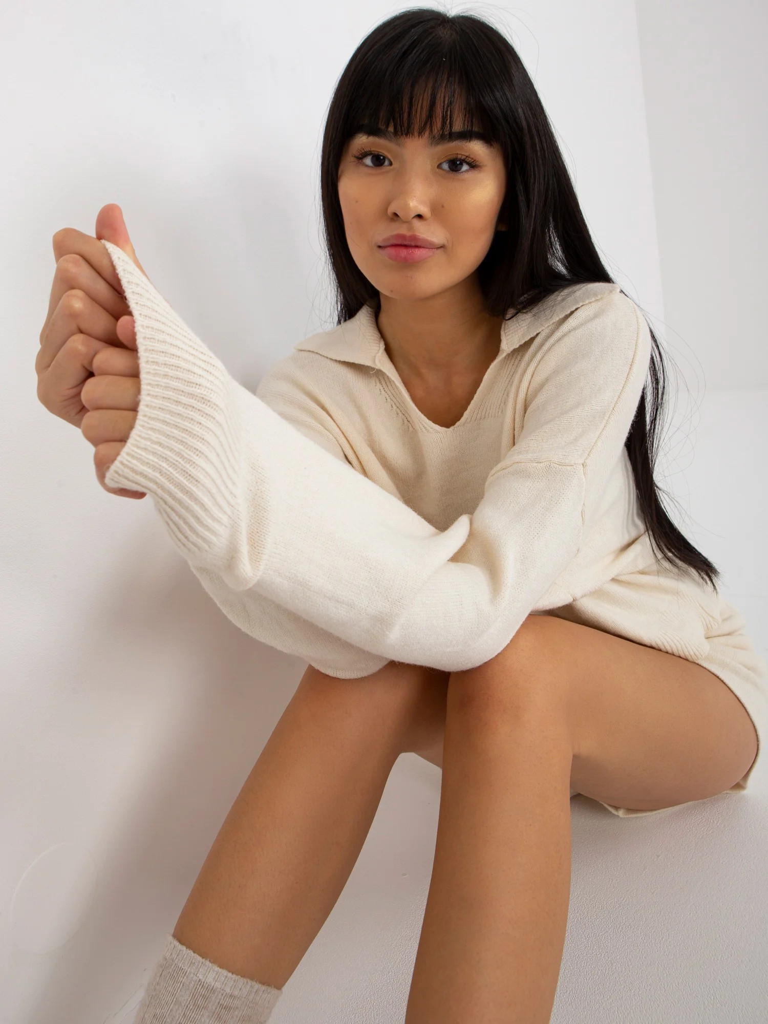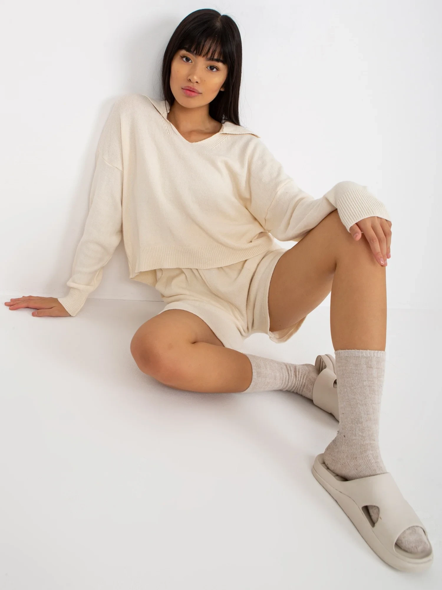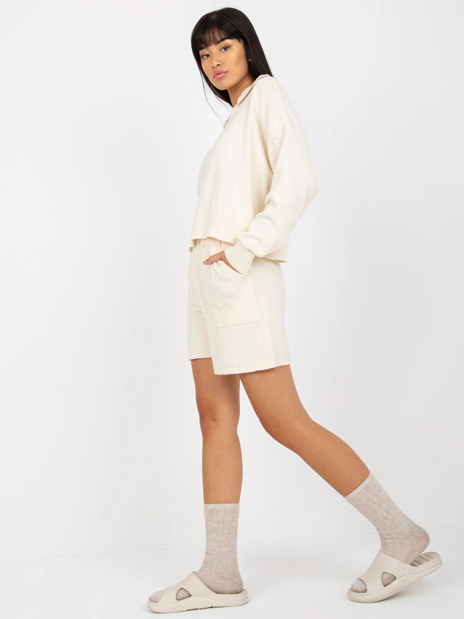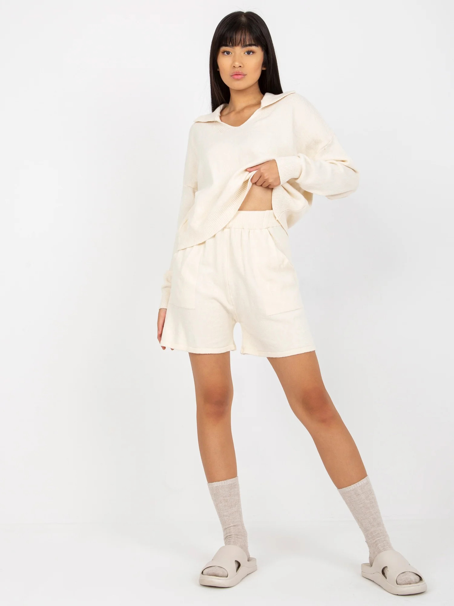 Rozměry soupravy v jedné velikosti měřené na plocho: šířka svetru v podpaží - 59 cm, délka rukávu - 60 cm, délka svetru - 52 cm, šířka šortek v pase -34 cm, výška v pase - 36 cm, délka šortek - 43 cm.EAN čárové kódy zboží jsou: