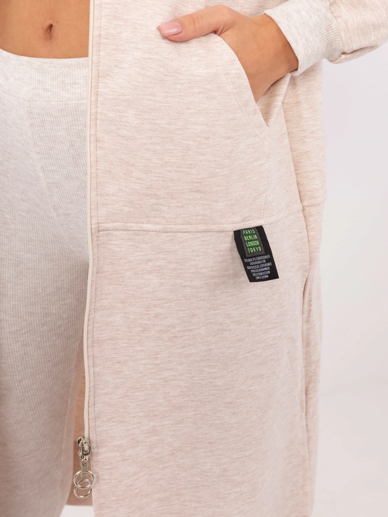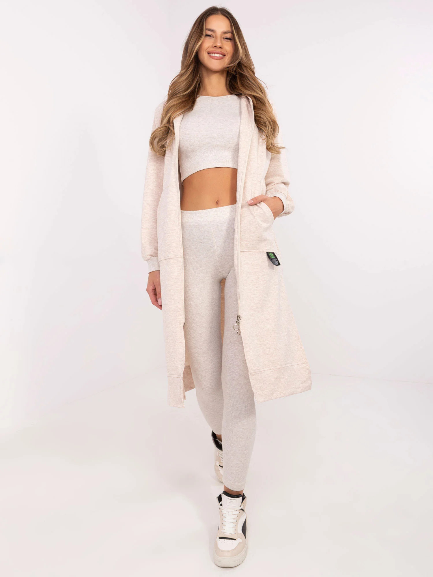 skład materiału bluzy: 72% bawełna, 22% poliester, 6% elastan; skład materiału legginsów i topu: 90% bawełna, 10% elastan