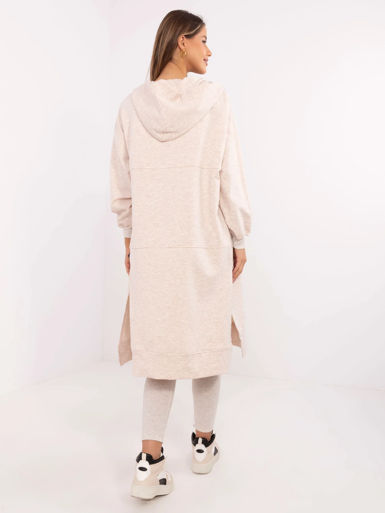 Wymiary bluzy w rozmiarze one size mierzone na płasko: szerokość bluzy pod pachami - 57 cm, długość bluzy - 107 cm, długość rękawa - 52 cm, obwód w biodrach - 108 cm.