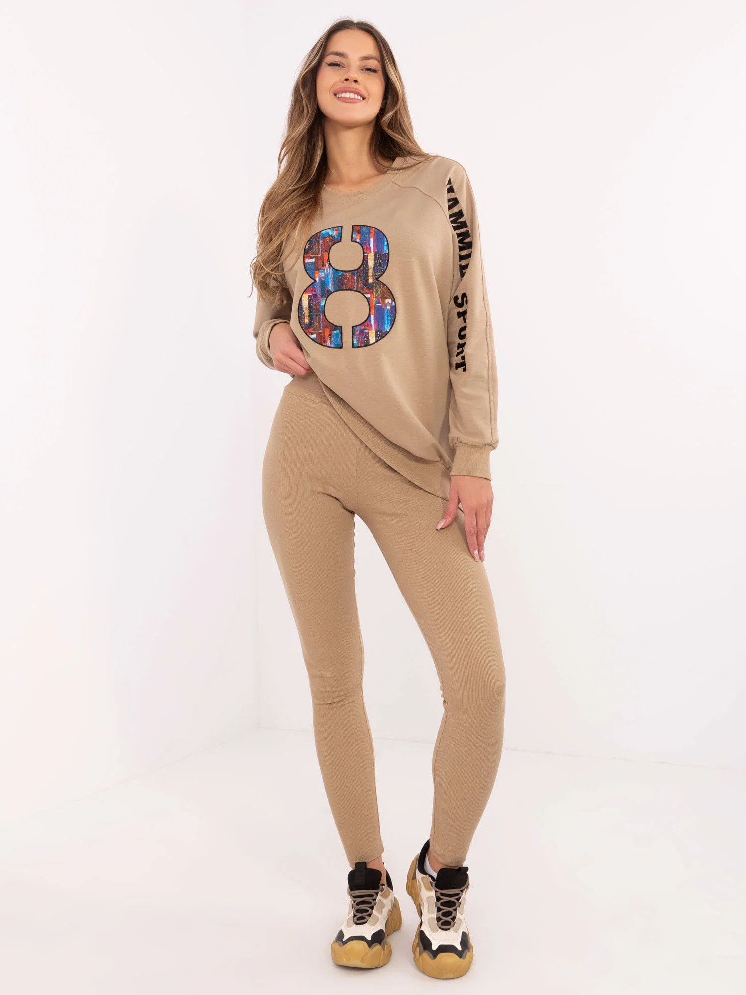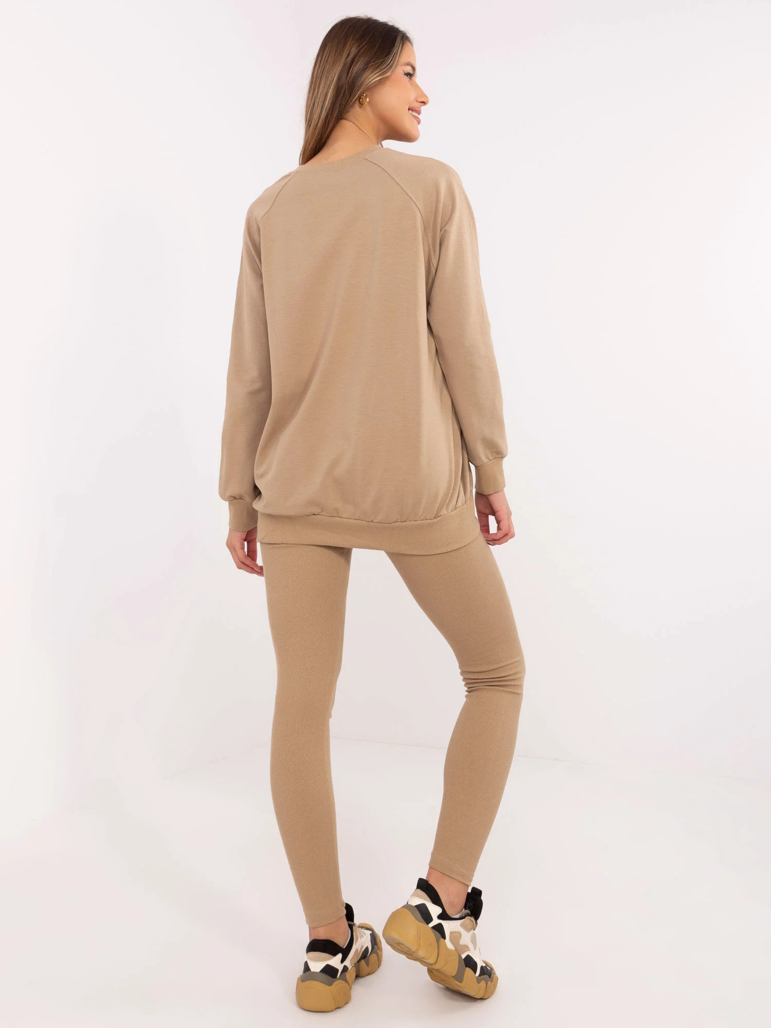 skład materiału bluzy: 72% bawełna, 22% poliester, 6% elastan; skład materiału legginsów: 90% bawełna, 10% elastan