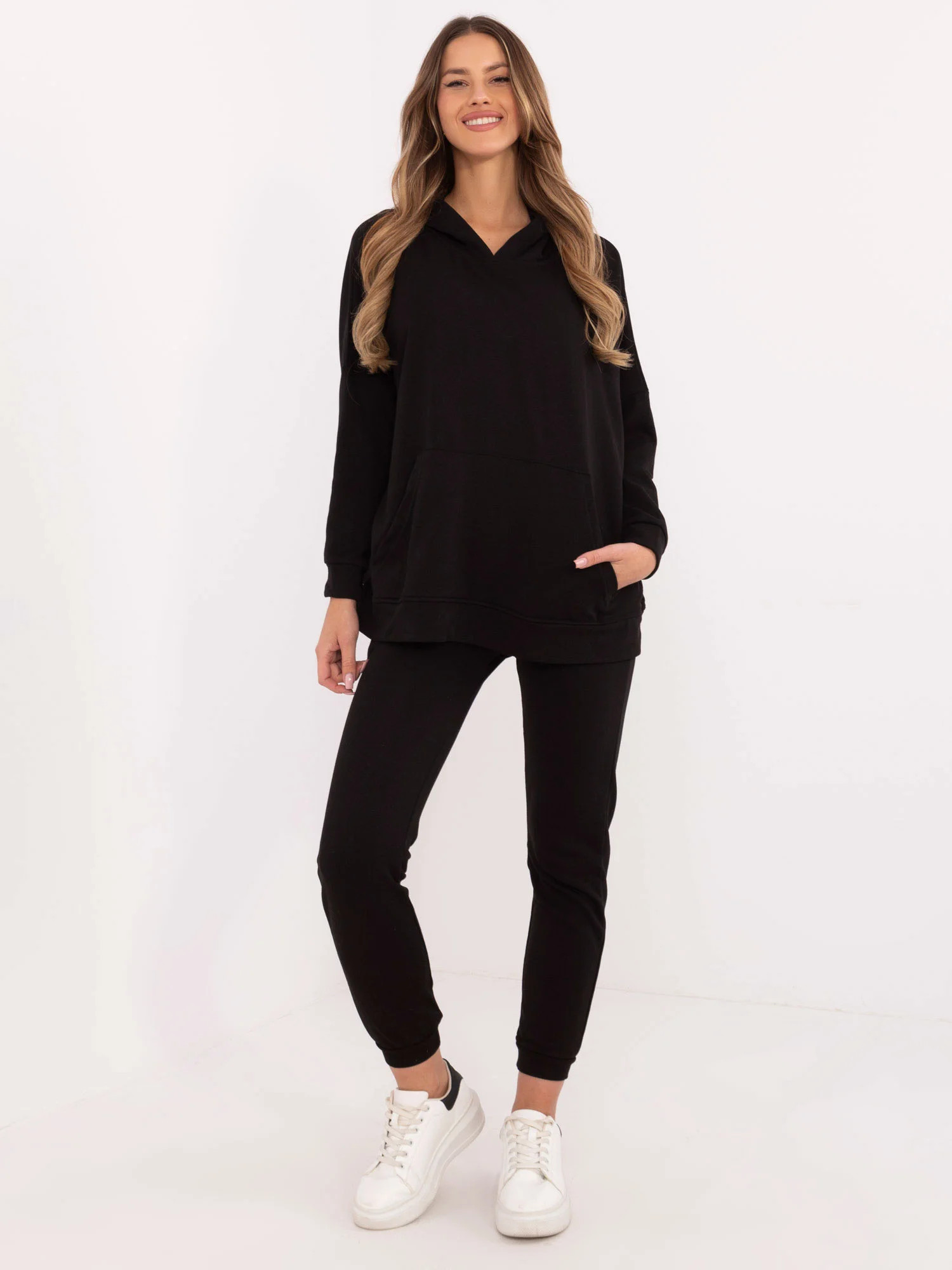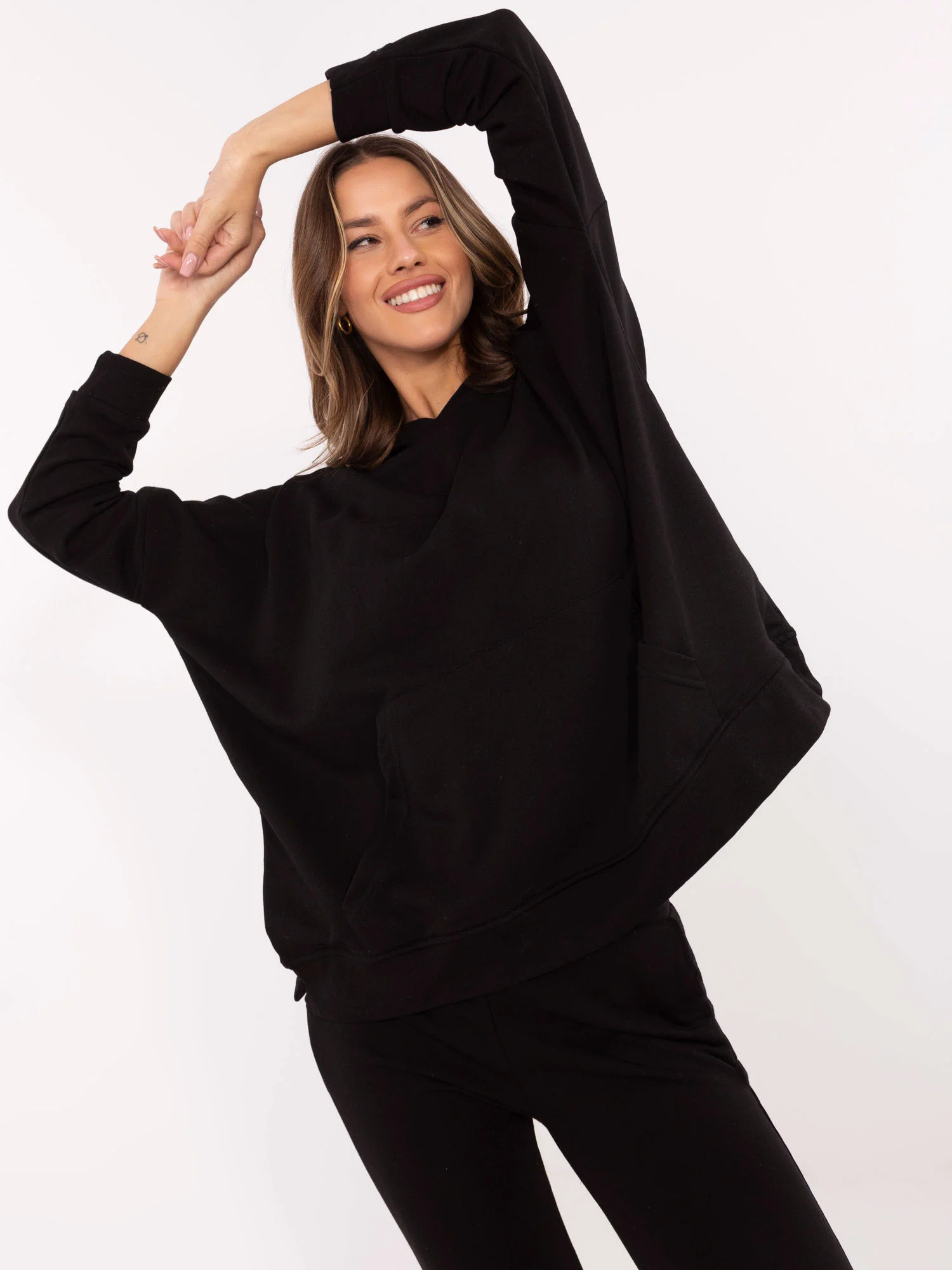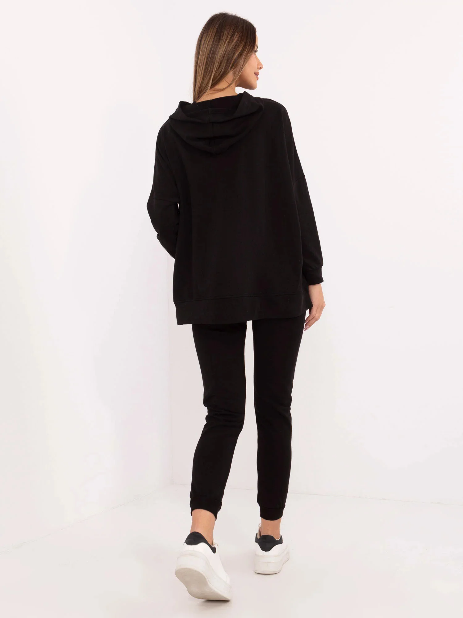 Wymiary bluzy w rozmiarze one size mierzone na płasko: szerokość bluzy pod pachami - 82 cm, długość bluzy - 71 cm, długość rękawa - 37 cm (od szwu), obwód w biodrach - 138 cm.