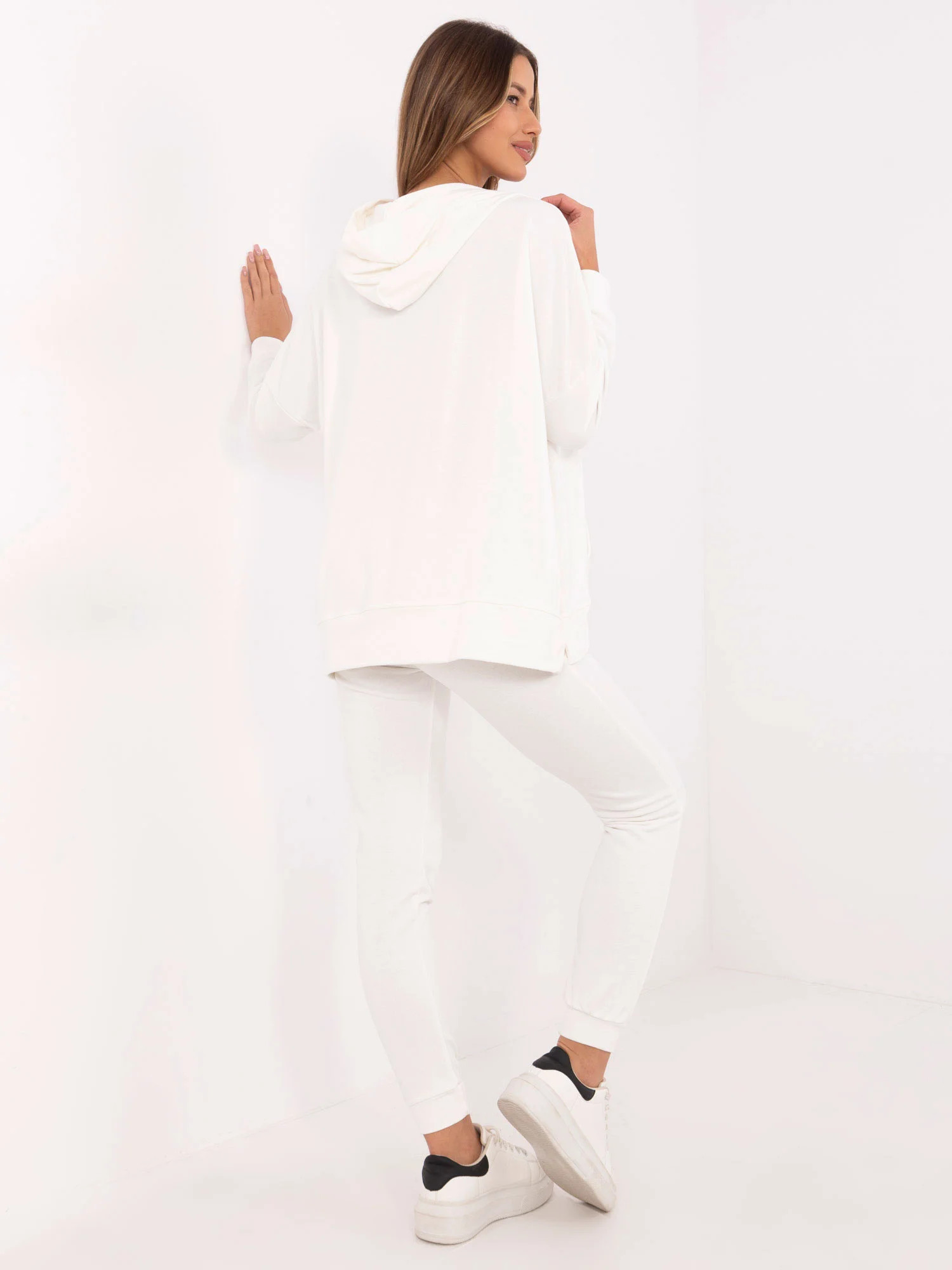 Wymiary bluzy w rozmiarze one size mierzone na płasko: szerokość bluzy pod pachami - 82 cm, długość bluzy - 71 cm, długość rękawa - 37 cm (od szwu), obwód w biodrach - 138 cm.