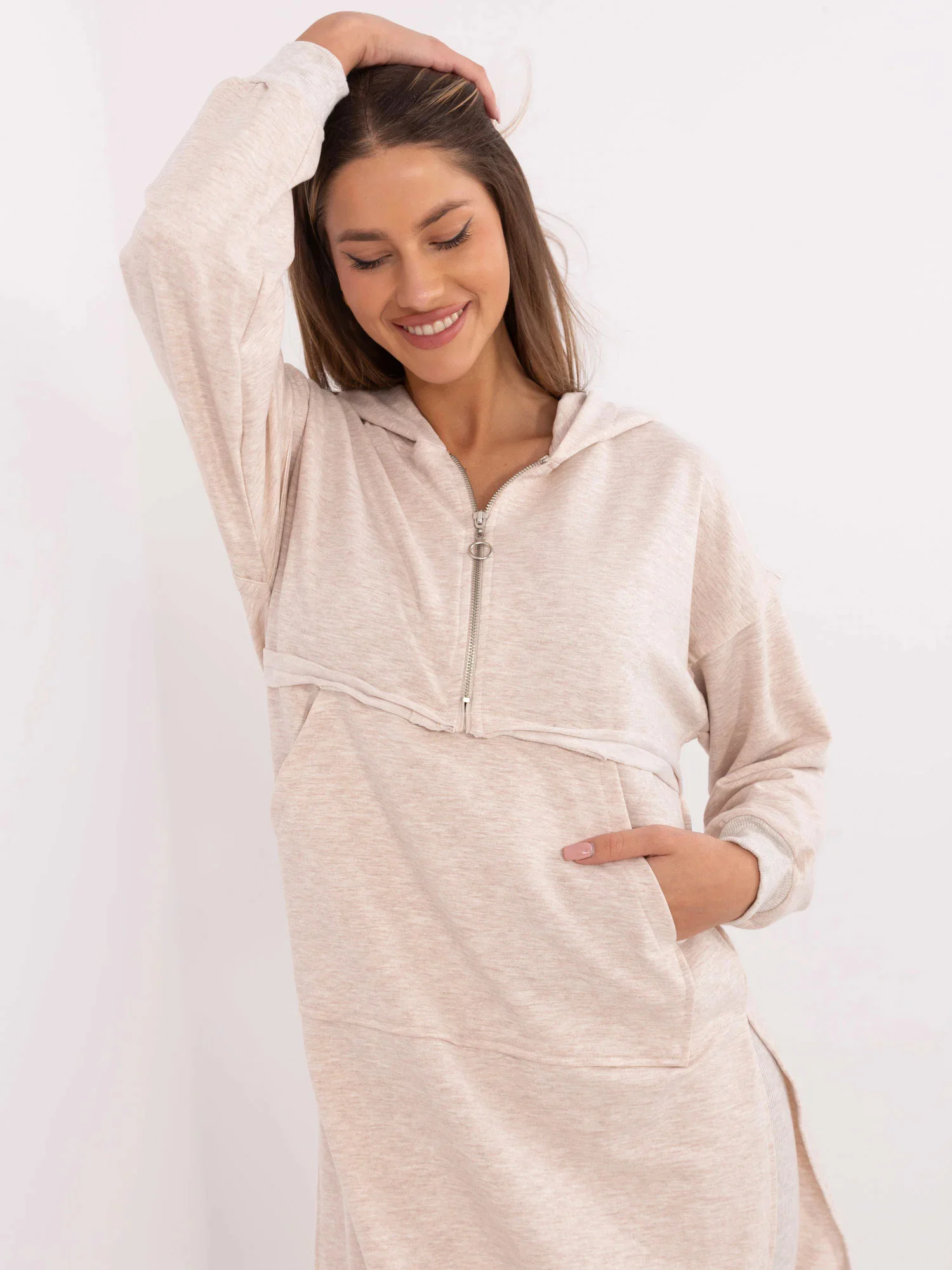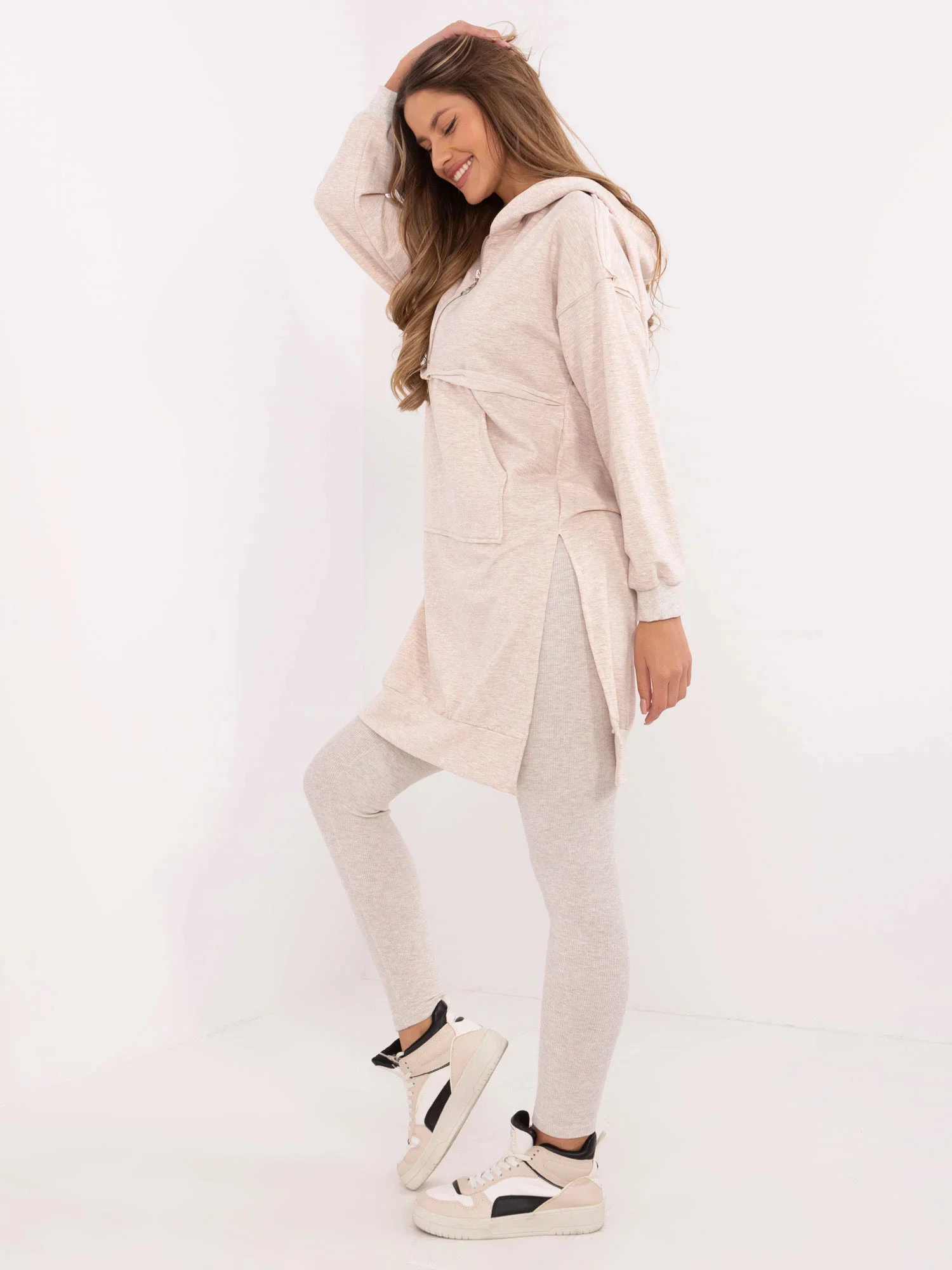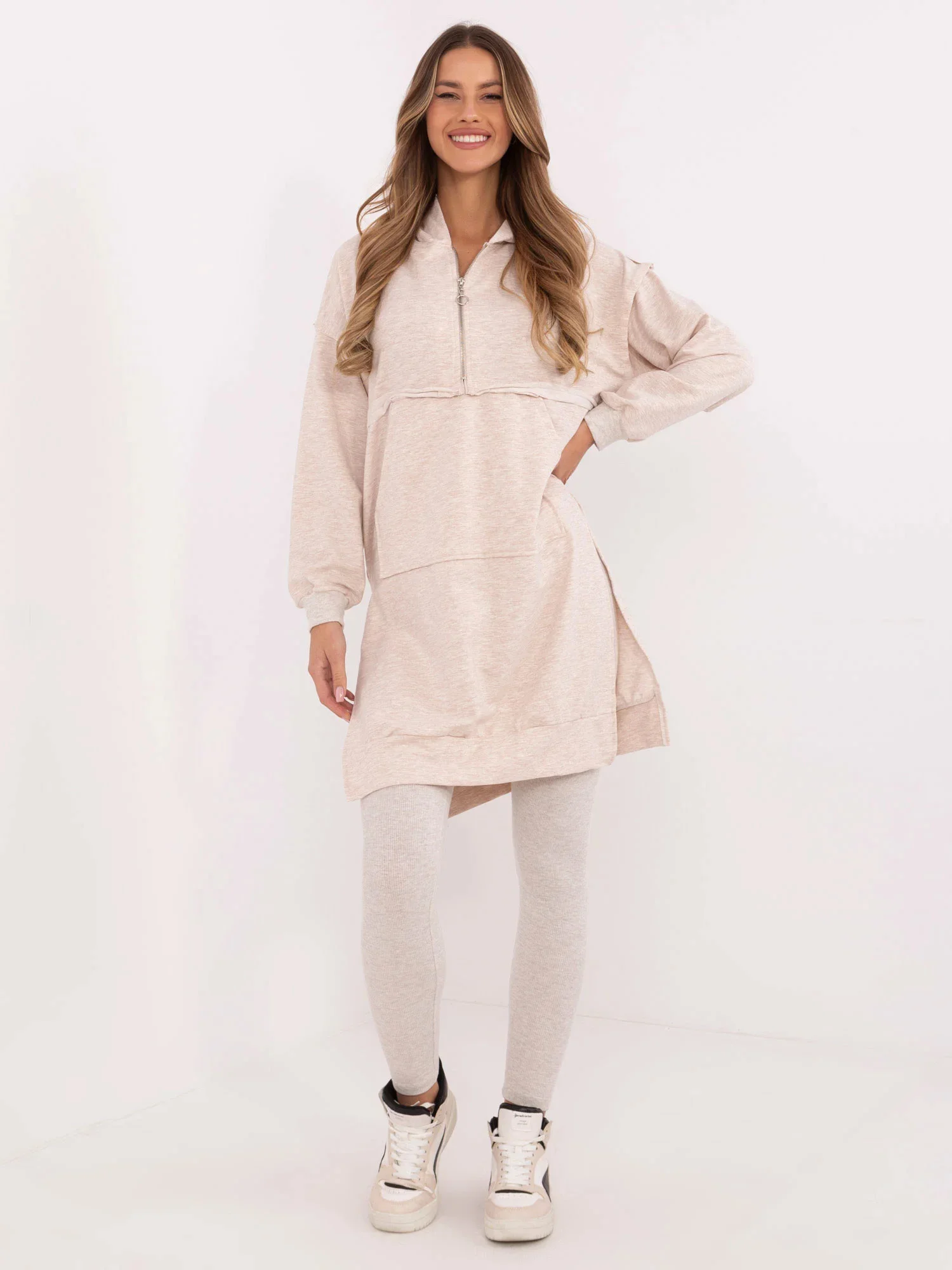 Wymiary bluzy w rozmiarze one size mierzone na płasko: szerokość bluzy pod pachami - 59 cm, długość bluzy - 94 cm, długość rękawa - 50 cm (od szwu), obwód w biodrach - 108 cm.