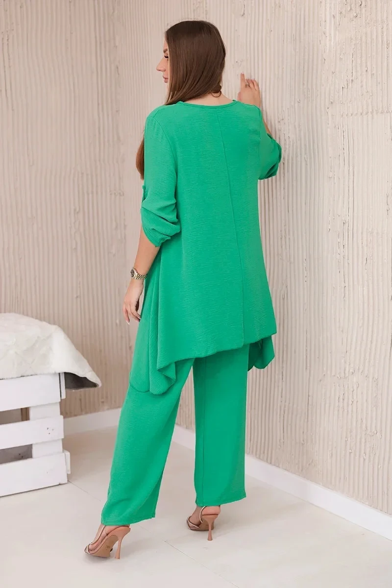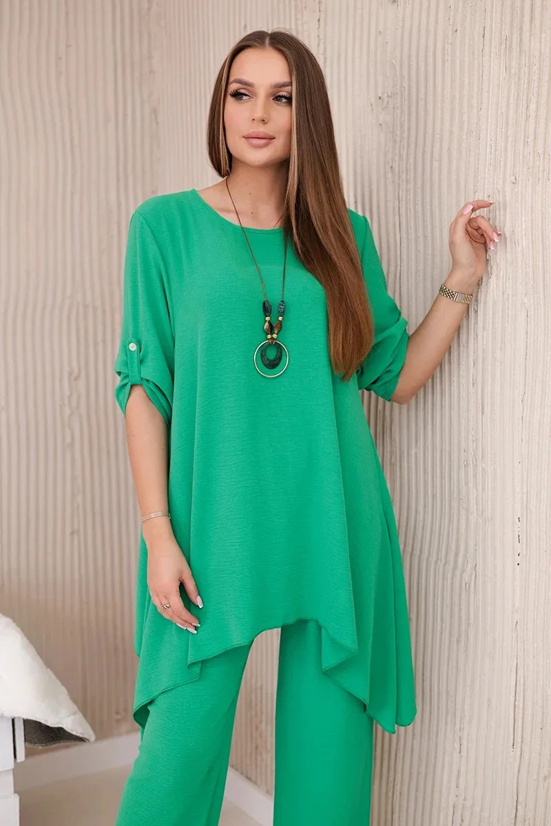 Italská dvoudílná souprava skládající se z rozšířené halenky a kalhot je elegantní souprava, která dodá kouzlo a styl každému stylu. Rozevlátá halenka dodává jemnou ženskost, zvýrazňuje postavu a zároveň zajišťuje volnost pohybu. Klasický střih kalhot dokonale ladí s elegantní halenkou a tvoří tak ucelený a stylový celek. Přívěsek ve tvaru klíče je navíc okouzlujícím detailem, který dodává této sadě originalitu a charakter a vytváří harmonickou kompozici. Jde o elegantní doplněk, který zdůrazňuje jedinečnost a smysl pro detail v celém stylingu. Tato italská souprava je ideální pro mnoho příležitostí, od obchodních schůzek až po romantická rande. Toto je rafinovaná volba pro lidi, kteří oceňují eleganci a pohodlí v jednom. Velikost je univerzální a padne ženám, které nosí velikost S, M nebo L.