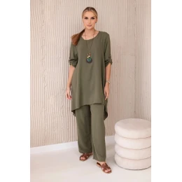 Italská dvoudílná souprava skládající se z rozšířené halenky a kalhot je elegantní souprava, která dodá kouzlo a styl každému stylu. Rozevlátá halenka dodává jemnou ženskost, zvýrazňuje postavu a zároveň zajišťuje volnost pohybu. Klasický střih kalhot dokonale ladí s elegantní halenkou a tvoří tak ucelený a stylový celek. Přívěsek ve tvaru klíče je navíc okouzlujícím detailem, který dodává této sadě originalitu a charakter a vytváří harmonickou kompozici. Jde o elegantní doplněk, který zdůrazňuje jedinečnost a smysl pro detail v celém stylingu. Tato italská souprava je ideální pro mnoho příležitostí, od obchodních schůzek až po romantická rande. Toto je rafinovaná volba pro lidi, kteří oceňují eleganci a pohodlí v jednom. Velikost je univerzální a padne ženám, které nosí velikost S, M, L, XL.