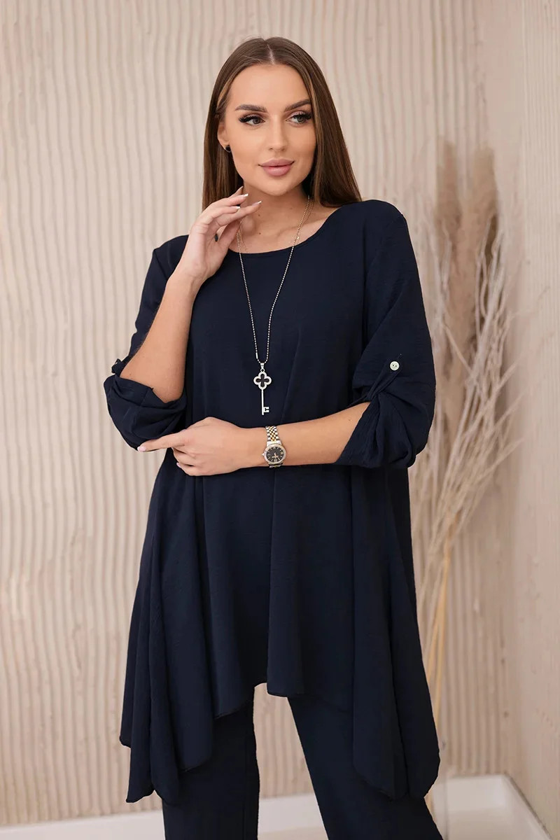 Italská dvoudílná souprava skládající se z rozšířené halenky a kalhot je elegantní souprava, která dodá kouzlo a styl každému stylu. Rozevlátá halenka dodává jemnou ženskost, zvýrazňuje postavu a zároveň zajišťuje volnost pohybu. Klasický střih kalhot dokonale ladí s elegantní halenkou a tvoří tak ucelený a stylový celek. Přívěsek ve tvaru klíče je navíc okouzlujícím detailem, který dodává této sadě originalitu a charakter a vytváří harmonickou kompozici. Jde o elegantní doplněk, který zdůrazňuje jedinečnost a smysl pro detail v celém stylingu. Tato italská souprava je ideální pro mnoho příležitostí, od obchodních schůzek až po romantická rande. Toto je rafinovaná volba pro lidi, kteří oceňují eleganci a pohodlí v jednom. Velikost je univerzální a padne ženám, které nosí velikost S, M nebo L.