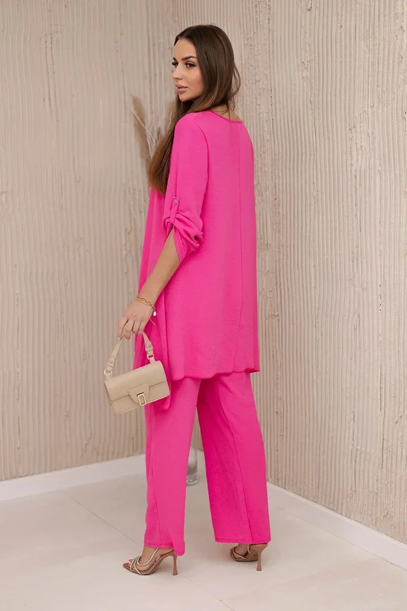 Italská dvoudílná souprava skládající se z rozšířené halenky a kalhot je elegantní souprava, která dodá kouzlo a styl každému stylu. Rozevlátá halenka dodává jemnou ženskost, zvýrazňuje postavu a zároveň zajišťuje volnost pohybu. Klasický střih kalhot dokonale ladí s elegantní halenkou a tvoří tak ucelený a stylový celek. Přívěsek ve tvaru klíče je navíc okouzlujícím detailem, který dodává této sadě originalitu a charakter a vytváří harmonickou kompozici. Jde o elegantní doplněk, který zdůrazňuje jedinečnost a smysl pro detail v celém stylingu. Tato italská souprava je ideální pro mnoho příležitostí, od obchodních schůzek až po romantická rande. Toto je rafinovaná volba pro lidi, kteří oceňují eleganci a pohodlí v jednom. Velikost je univerzální a padne ženám, které nosí velikost S, M nebo L.
